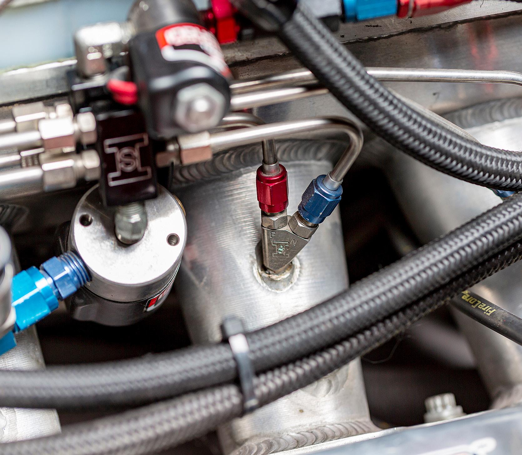 lube. A Mezeire electric water pump manages cooling circulation duties and a Jesel belt drive mated to an MSD front-drive distributor and Power Grid ignition box spreads the spark around through Moroso Ultra 40 wires. A custom Product Engineering fuel pump and filter were selected to supply the copious amounts of required fossil fuel, and all the vital fluids are delivered via Russell Performance fittings and lines.
