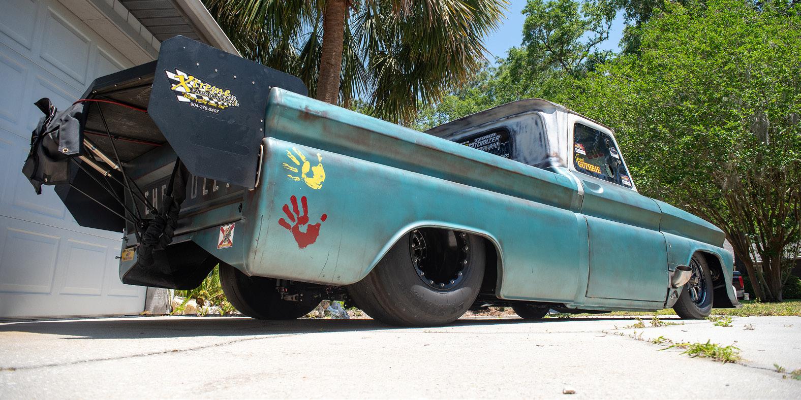 One thing it’s not is a Ford 9-inch! Rowe chose to keep his Chevrolet as much Chevy as possible and built a tough-as-nails 8.5 GM diff which includes Moser Engineering 33-spline axles, a Moser spool, C-clip eliminators, and Motive Gears 4.33:1 ring and pinion. Calvert Racing split mono-leaf springs with Caltracs and Menscer Motorsports double-adjustable rear shocks are used to plant the rear tires following Rowe’s skyhigh adventure in 2023. The front suspension was also upgraded with TRZ upper and lower control arms, travel limiters and AFCO double-adjustable shocks.