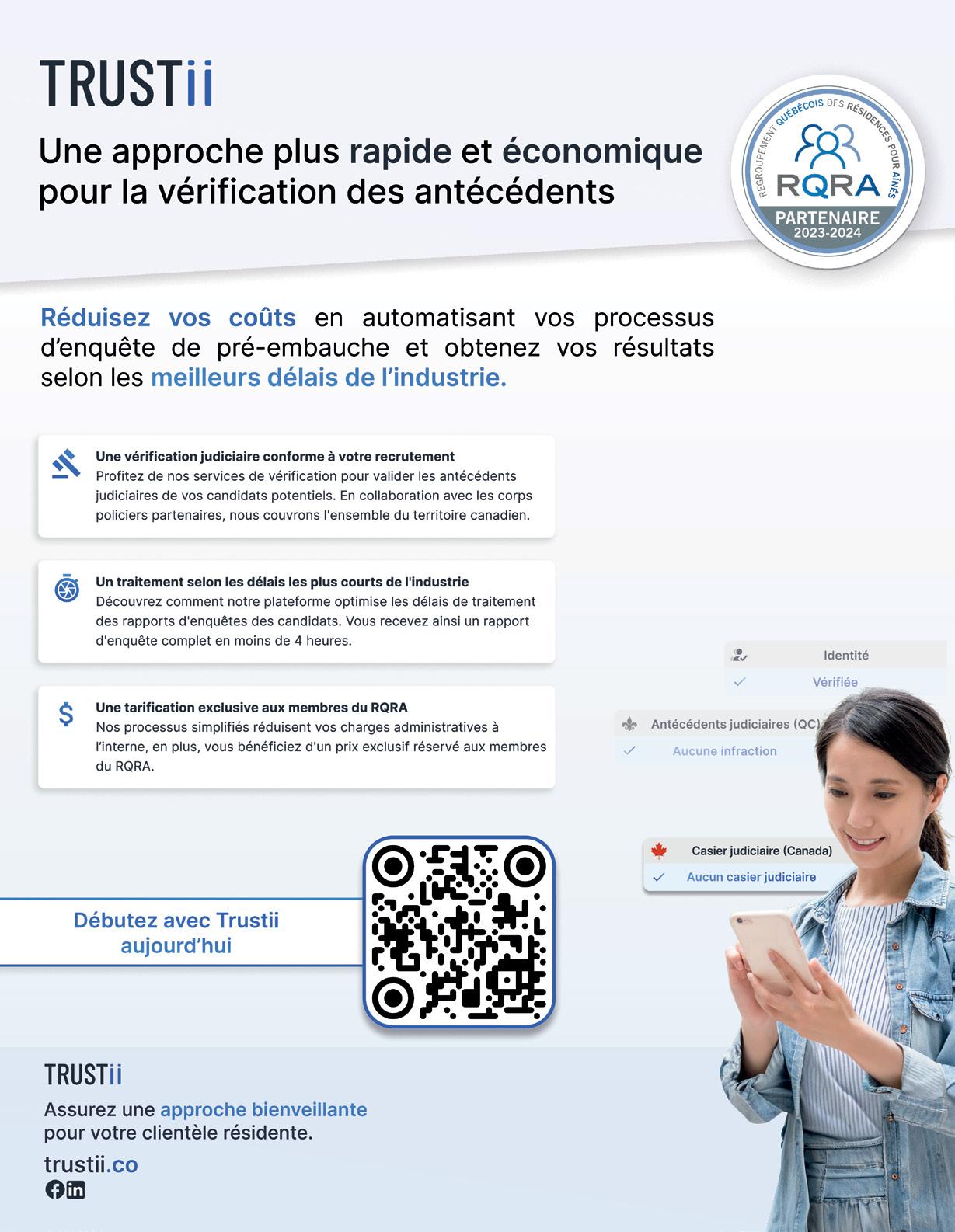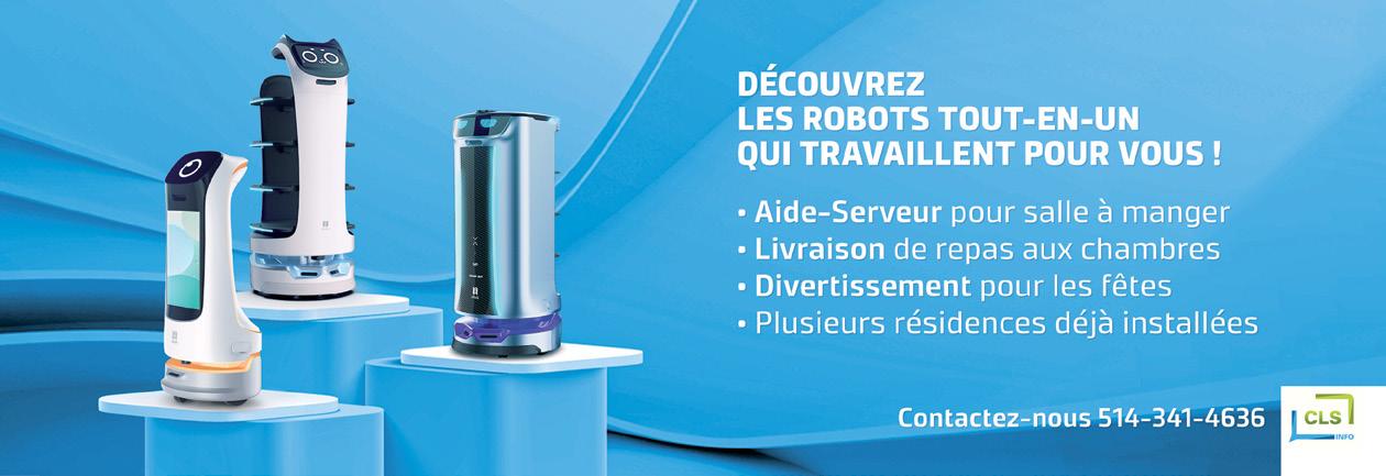 22 Saviez-vous que… 8 Robotique dans les RPA : un guide pratique pour s’orienter 44 L’innovation sociale en RPA 46 Mission d’étude aux Pays-Bas – Les soins de longue durée, une responsabilité qui appartient à tous ! 47 Nos partenaires dans l’innovation 57 À l’agenda ! 58 Perspectives internationales : l’hébergement des aînés au Portugal 51 Gérer les réclamations mixtes : prendre en compte les aspects physiques et psychologiques 54 Dépôt légal - Bibliothèque et Archives nationales du Québec Dépôt légal - Bibliothèque et Archives Canada ISSN : 2369-5765 L’ADRESSE PRINTEMPS 2024