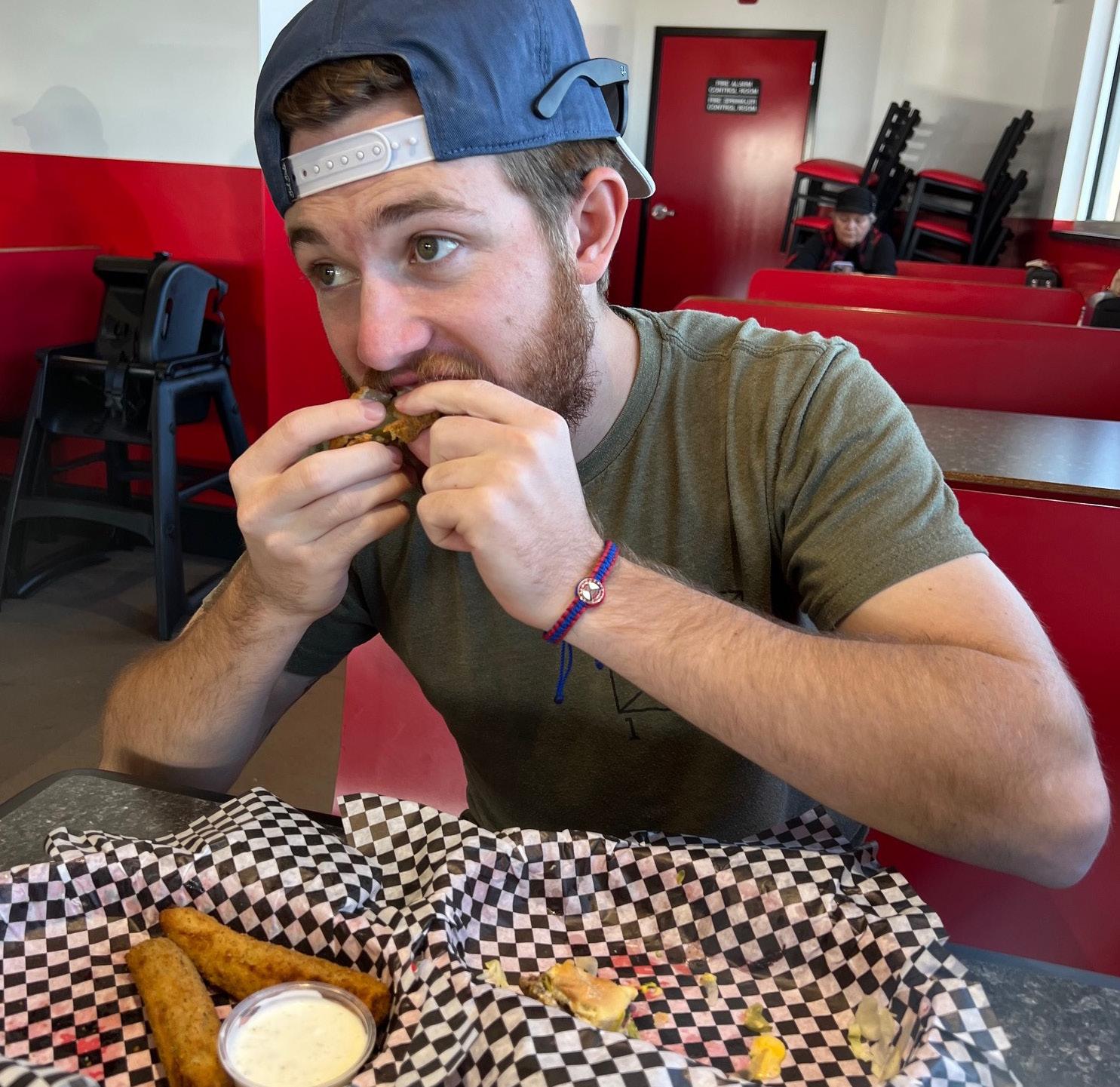 Luke Oleson takes a big bite of a deep-fried pickle during his meal at Munchies Burgers on Dec. 5. Oleson, a Colorado Mesa University student, said he used to eat at Munchies Pizza & Deli in Fruita when he was in high school. He said he now lives near Whitewater and often drives into Grand Junction on 29 Road. “I saw (Munchies Burgers) was being built, didn’t know it was open until today when I drove by,” he said.