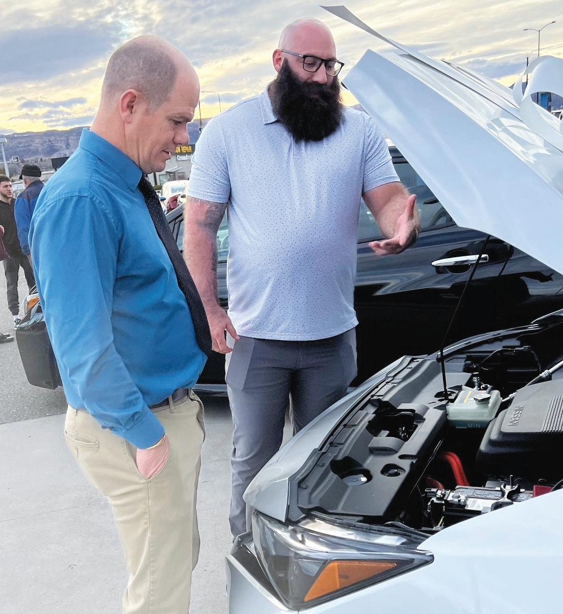 Bookcliff Middle School teacher Ryan McLaughlin, left, listens to Red Rock Auto Group sales consultant Ryan Galarza tell him about the 2025 Nissan Leaf’s electric engine on Feb. 4 at the Red Rock Nissan auto dealership in Grand Junction. McLaughlin was one of six School District 51 staff members who received a White Iced Award from the District 51 Foundation on Feb. 1, then found out Red Rock Auto Group gifted each of them with a 2025 Nissan Leaf to drive for free on a two-year lease. Photo by Tim Harty.