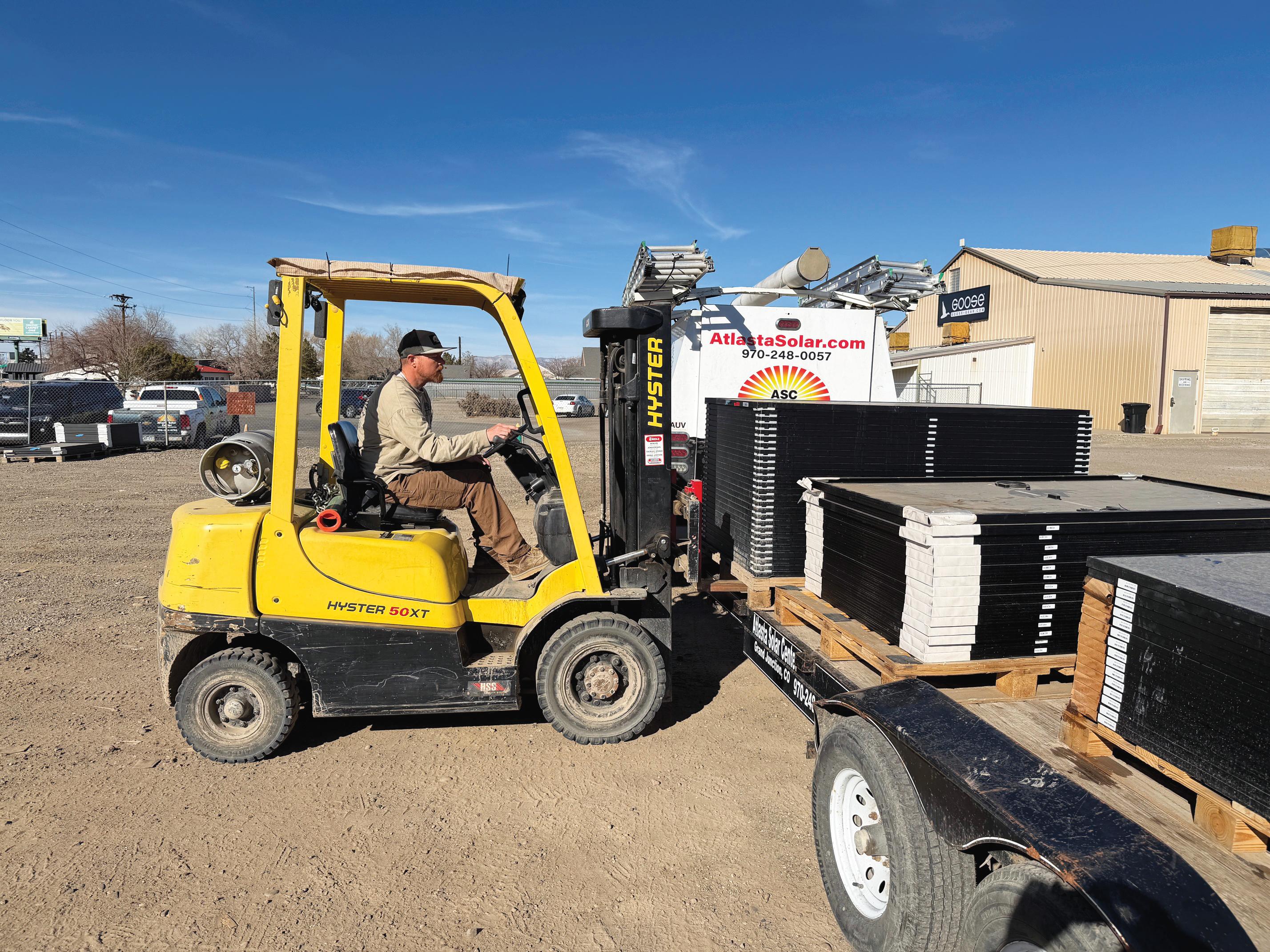 Atlasta Solar Center co-owner and journeyman electrician Todd Sheveland operates a forklift to move some solar panels from a flatbed trailer. The center’s new location has 2,100 square feet of additional yard storage space, and Sheveland said, “We’re happy to be over here, and in a few more weeks I think we’ll really be settled in.”