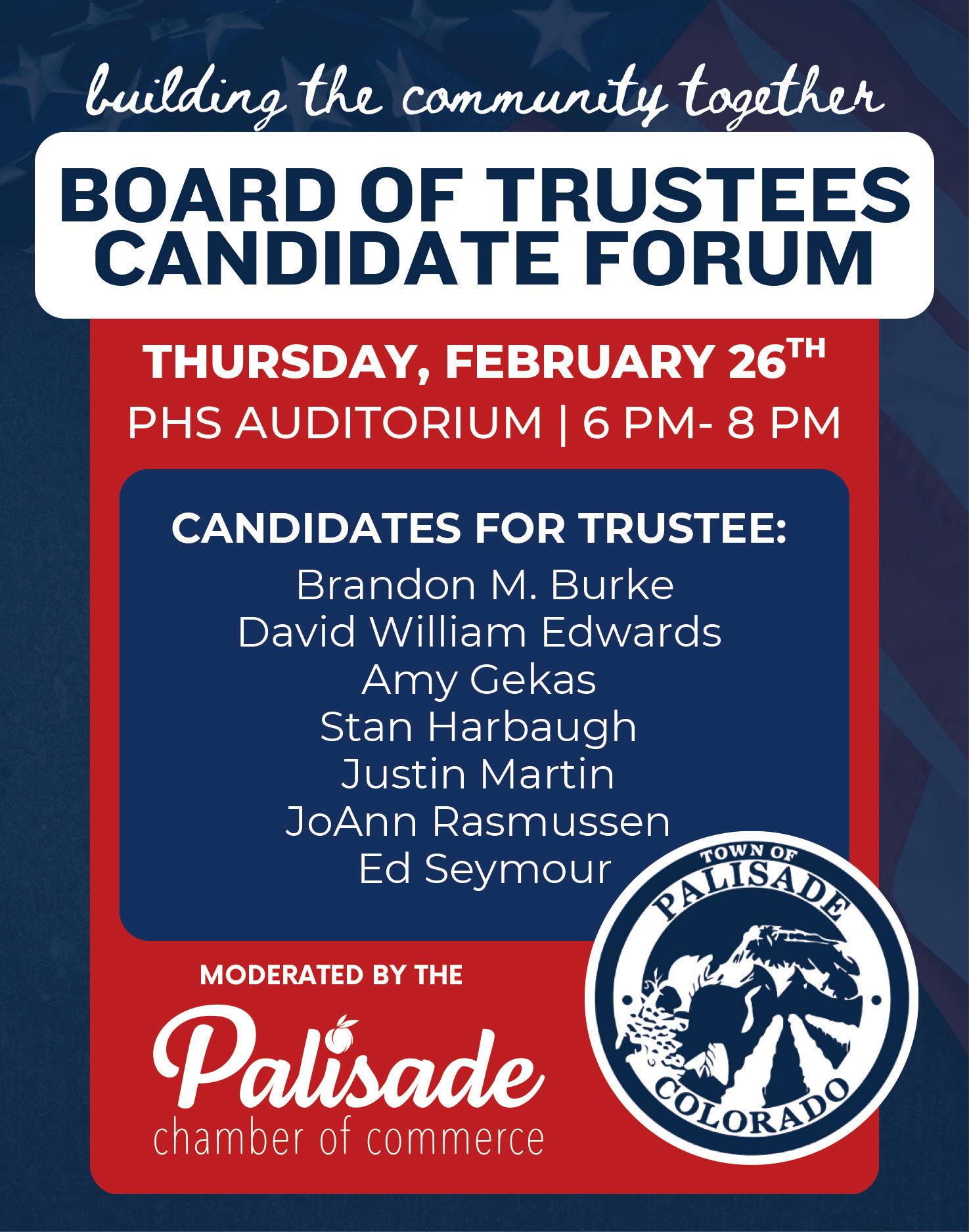 The Board of Trustee Candidate Forum is scheduled for Thursday, Feb. 26, at the Palisade High School auditorium. Doors open at 6 p.m., and the forum begins at 6:30 p.m.