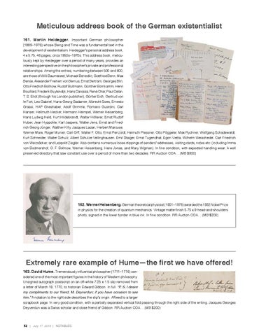 Meticulous address book of the German existentialist 161. Martin Heidegger. Important German philosopher (1889–1976) whose Being and Time was a fundamental text in the development of existentialism. Heidegger’s personal address book, 4 x 5.75, 46 pages, circa 1950s–1970s. This address book, meticulously kept by Heidegger over a period of many years, provides an interesting perspective on the philosopher’s private and professional relationships. Among the entries, numbering between 500 and 600, are those of Willi Baumeister, Michael Benedikt, Gottfried Benn, Max Bense, Alexander Freiherr von Bernus, Ernst Bertram, Georges Blin, Otto Friedrich Bollnow, Rudolf Bultmann, Günther Bornkamm, Henri Bouillard, Frederik Buytendijk, Hans Carossa, René Char, Paul Celan, T. S. Eliot (through his London publisher), Günter Eich, Gertrud von le Fort, Leo Gabriel, Hans-Georg Gadamer, Albrecht Goes, Ernesto Grassi, HAP Grieshaber, Adolf Grimme, Romano Guardini, Carl Hanser, Hellmuth Hecker, Hermann Heimpel, Werner Heisenberg, Hans Ludwig Held, Kurt Hildebrandt, Walter Höllerer, Ernst Rudolf Huber, Jean Hyppolite, Karl Jaspers, Walter Jens, Ernst and Friedrich Georg Jünger, Walther Killy, Jacques Lacan, Herbert Marcuse, Werner Marx, Roger Munier, Carl Orff, Walter F. Otto, Ernst Penzoldt, Helmuth Plessner, Otto Pöggeler, Max Rychner, Wolfgang Schadewaldt, Kurt Schneider, Walter Schulz, Albert Schulze Vellinghausen, Emil Staiger, Ernst Tugendhat, Egon Vietta, Wilhelm Weischedel, Carl Friedrich von Weizsäcker, and Leopold Ziegler. Also contains numerous loose clippings of senders’ addresses, visiting cards, notes etc. (including Imma von Bodmershof, O. F. Bollnow, Werner Heisenberg, Hans Jonas, and Mary Wigman). In fine condition, with expected handling wear. A well preserved directory that saw constant use over a period of more than two decades. RR Auction COA.…(MB $300)