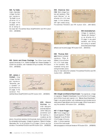 436. Dwight and Mamie Eisenhower. Two signatures: vintage ink signature, “Dwight D. Eisenhower,” on an off-white 4.5 x 2.5 page; and a White House card, signed in ink, “Mamie Doud Eisenhower.” Page in very good condition, with moderate toning to borders and a clear piece of tape affixed over the entire page; White House card in very fine condition. RR Auction COA.…(MB $200) 437. F. Scott Fitzgerald. Florid vintage foun-