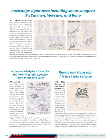 Backstage signatures including show-stoppers McCartney, Mercury, and Bono 780. Live Aid. A fantastic collec-