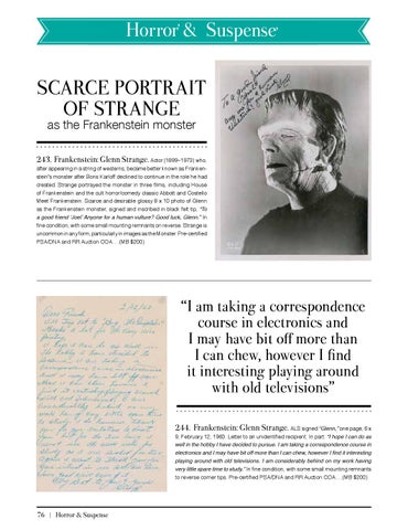 “I am taking a correspondence course in electronics and I may have bit off more than I can chew, however I find it interesting playing around with old televisions” 244. Frankenstein: Glenn Strange. ALS signed “Glenn,” one page, 6 x 9, February 12, 1963. Letter to an unidentified recipient. In part: “I hope I can do as well in the hobby I have decided to pursue. I am taking a correspondence course in electronics and I may have bit off more than I can chew, however I find it interesting playing around with old televisions. I am considerably behind on my work having very little spare time to study.” In fine condition, with some small mounting remnants to reverse corner tips. Pre-certified PSA/DNA and RR Auction COA.…(MB $200)