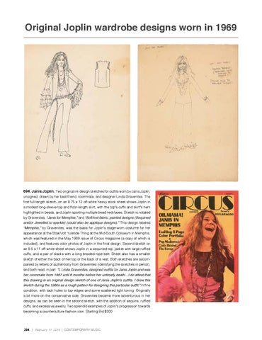 694. Janis Joplin. Two original ink design sketches for outfits worn by Janis Joplin, unsigned, drawn by her best friend, roommate, and designer Linda Gravenites. The first full-length sketch, on an 8.75 x 12 off-white heavy stock sheet shows Joplin in a modest long-sleeve top and floor-length skirt, with the top’s cuffs and skirt’s hem highlighted in beads, and Joplin sporting multiple bead necklaces. Sketch is notated by Gravenites, “Janis for Memphis,” and “Soft knit fabric, painted designs (Sequined and/or Jewelled to sparkle) (could also be applique designs).” This design labeled “Memphis,” by Gravenites, was the basis for Joplin’s stage-worn costume for her appearance at the Stax/Volt Yuletide Thing at the Mid-South Coliseum in Memphis, which was featured in the May 1969 issue of Circus magazine (a copy of which is included), and features color photos of Joplin in the final design. Second sketch on an 8.5 x 11 off-white sheet shows Joplin in a sequined top, jacket with large ruffled cuffs, and a pair of slacks with a long braided rope belt. Sheet also has a smaller sketch of either the back of her top or the back of a vest. Both sketches are accompanied by letters of authenticity from Gravenites (identifying the sketches in pencil), and both read, in part: “I, Linda Gravenites, designed outfits for Janis Joplin and was her roommate from 1967 until 6 months before her untimely death…I do attest that this drawing is an original design sketch of one of Janis Joplin’s outfits. I drew this sketch during the 1960s as a rough pattern for designing this particular outfit.” In fine condition, with tack holes to top edges and some scattered light toning. Originally a bit more on the conservative side, Gravenites became more adventurous in her designs, as can be seen in the second sketch, with the addition of sequins, ruffled cuffs, and excessive jewelry. Two splendid examples of Joplin’s progression towards becoming a counterculture fashion icon. Starting Bid $300