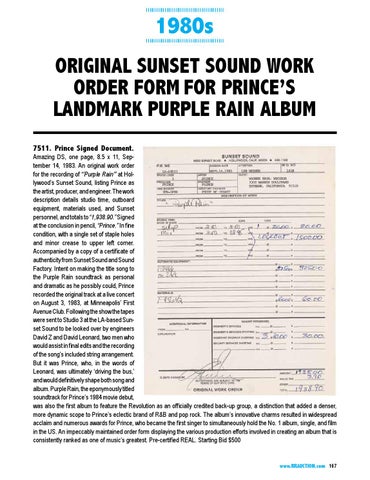 Amazing DS, one page, 8.5 x 11, September 14, 1983. An original work order for the recording of “’Purple Rain’” at Hollywood’s Sunset Sound, listing Prince as the artist, producer, and engineer. The work description details studio time, outboard equipment, materials used, and Sunset personnel, and totals to “1,938.90.” Signed at the conclusion in pencil, “Prince.” In fine condition, with a single set of staple holes and minor crease to upper left corner. Accompanied by a copy of a certificate of authenticity from Sunset Sound and Sound Factory. Intent on making the title song to the Purple Rain soundtrack as personal and dramatic as he possibly could, Prince recorded the original track at a live concert on August 3, 1983, at Minneapolis’ First Avenue Club. Following the show the tapes were sent to Studio 3 at the LA-based Sunset Sound to be looked over by engineers David Z and David Leonard, two men who would assist in final edits and the recording of the song’s included string arrangement. But it was Prince, who, in the words of Leonard, was ultimately ‘driving the bus,’ and would definitively shape both song and album. Purple Rain, the eponymously titled soundtrack for Prince’s 1984 movie debut, was also the first album to feature the Revolution as an officially credited back-up group, a distinction that added a denser, more dynamic scope to Prince’s eclectic brand of R&B and pop rock. The album’s innovative charms resulted in widespread acclaim and numerous awards for Prince, who became the first singer to simultaneously hold the No. 1 album, single, and film in the US. An impeccably maintained order form displaying the various production efforts involved in creating an album that is consistently ranked as one of music’s greatest. Pre-certified REAL. Starting Bid $500