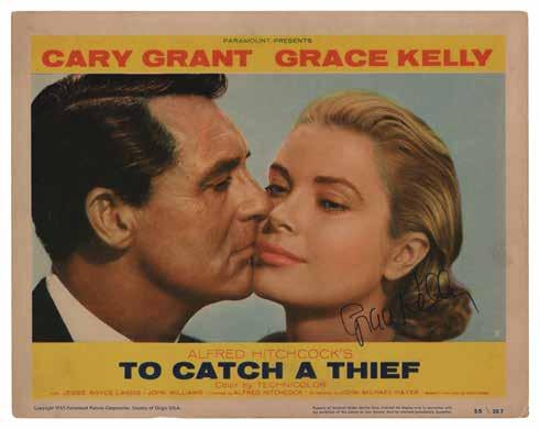 591. Grace Kelly Signed Lobby Card. Fantastic original color 14 x 11 lobby card for Alfred Hitchcock’s 1955 romantic thriller To Catch a Thief, signed in black felt tip by Grace Kelly. A pencil collector’s notation on the reverse indicates that the signature was obtained in person at Radio City Music Hall’s ‘Night of 100 Stars.’ In fine condition. Starting Bid $200