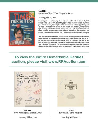 Lot 3029 Steve Jobs Signed Time Magazine Cover Starting Bid $1,000 Rare magazine cover featuring Steve Jobs removed from the February 15, 1982 issue of Time, 8.25 x 10.75, beautifully signed in the lower left in black ink, “steve jobs.” The cover story, “Striking It Rich,” portrays “Steven Jobs of Apple Computer” as one of “America’s Risk Takers.” In very good to fine condition, with scattered light creasing, a central horizontal mailing fold, and a light paperclip impression to the top edge. Accompanied by full letters of authenticity from PSA/DNA and Beckett Authentication Services, and a letter of provenance from the consignor. The Time article described the nation’s upstart tech entrepreneurs whose firms were beginning to meet with massive success—Apple went public with an IPO in 1980, and had grown dramatically by 1982. At the end of the year, it was rumored that Jobs was under consideration as a finalist for Time’s ‘Man of the Year’—instead, Time named ‘The Computer’ as its ‘Machine of the Year.’ A superior signed piece rooted in the beginnings of Steve Jobs’s much-publicized success.