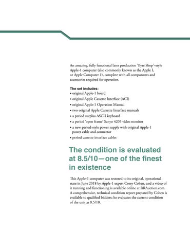 The condition is evaluated at 8.5/10—one of the finest in existence This Apple-1 computer was restored to its original, operational state in June 2018 by Apple-1 expert Corey Cohen, and a video of it running and functioning is available online at RRAuction.com. A comprehensive, technical condition report prepared by Cohen is available to qualified bidders; he evaluates the current condition of the unit as 8.5/10.