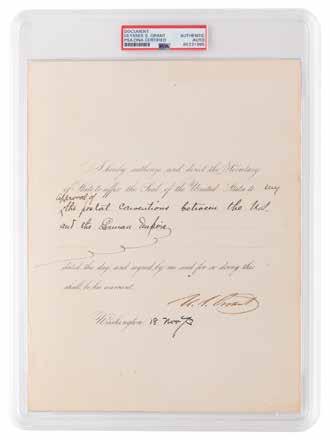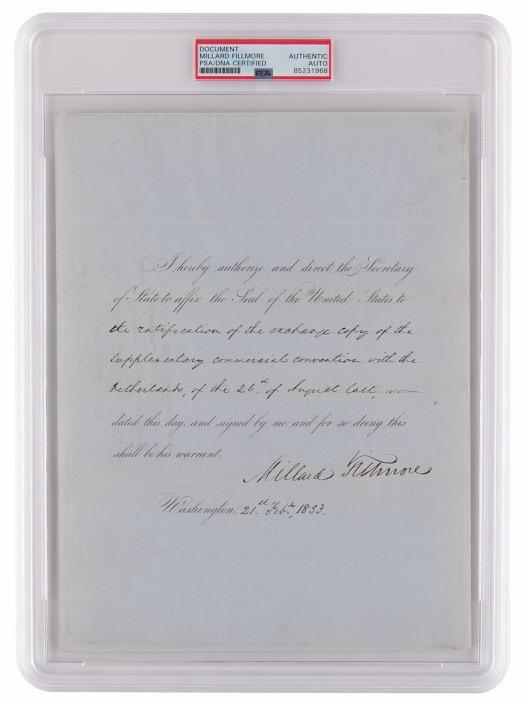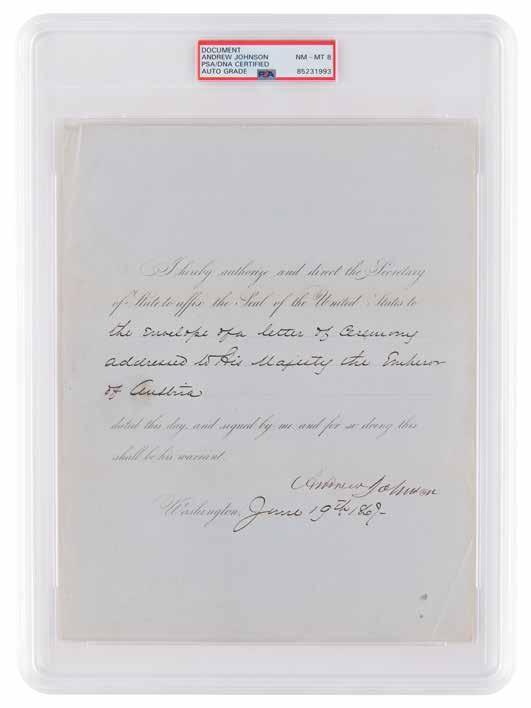 17. Andrew Johnson Document Signed as President - PSA NM-MT 8. Partly-printed DS as president, one page, 8 x 10, June 19, 1867. President Johnson authorizes and directs the Secretary of State to affix the Seal of the United States to “the envelope of a letter of Ceremony addressed to His Majesty the Emperor of Austria.” Signed neatly at the conclusion by Andrew Johnson. In fine condition, with light corner creasing and faint toning along the folds. Encapsulated and graded by PSA/DNA as “NM-MT 8.”