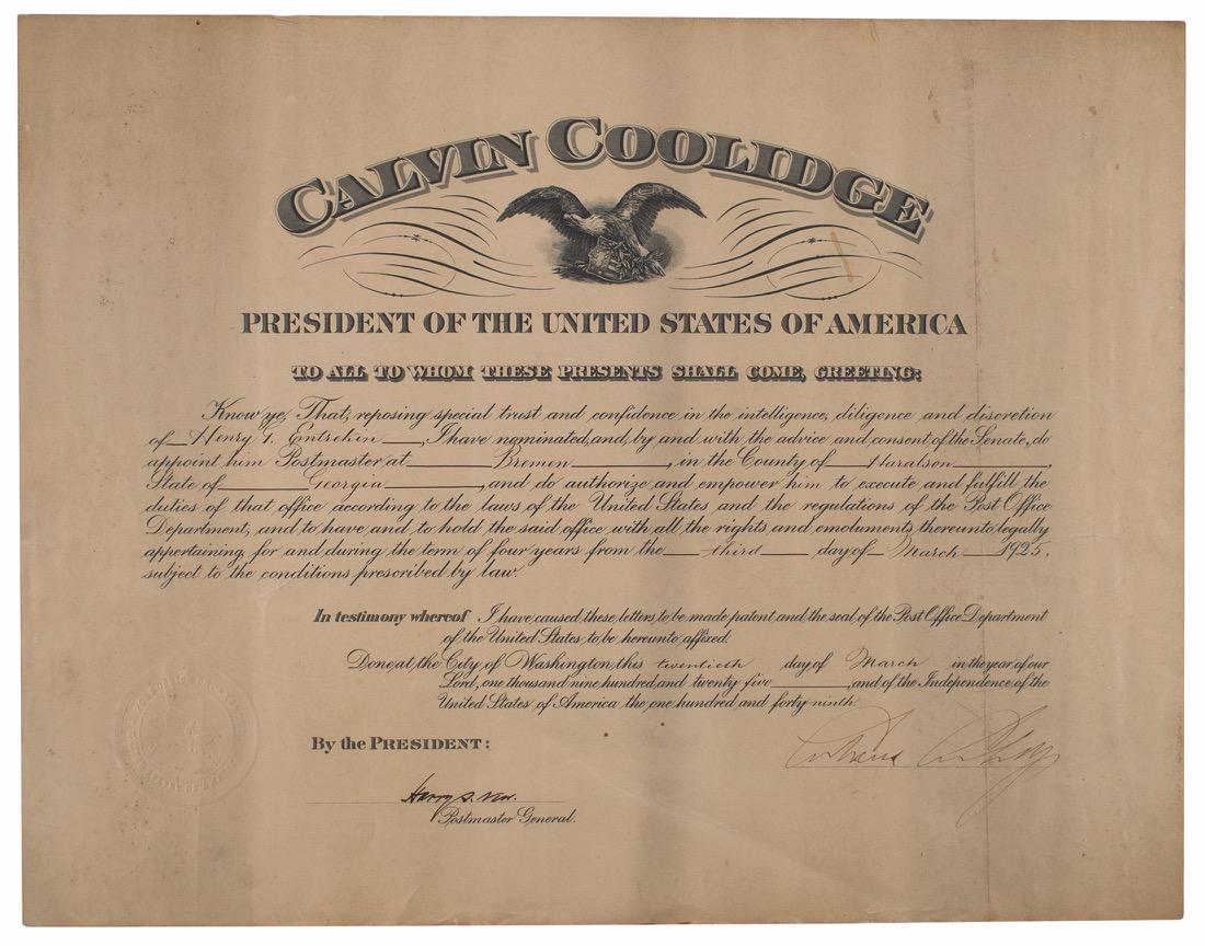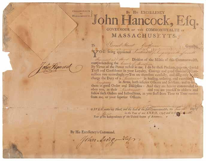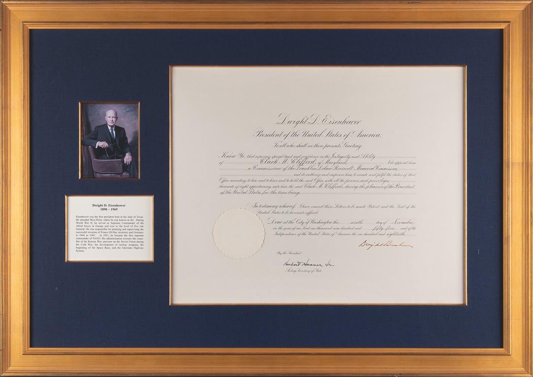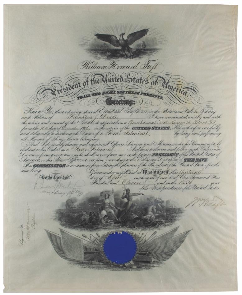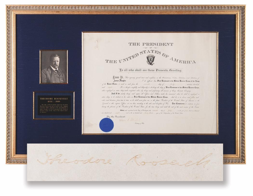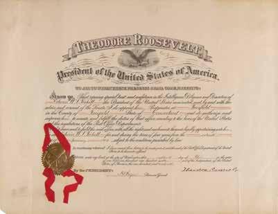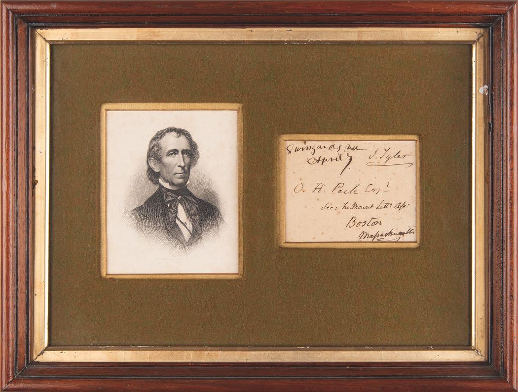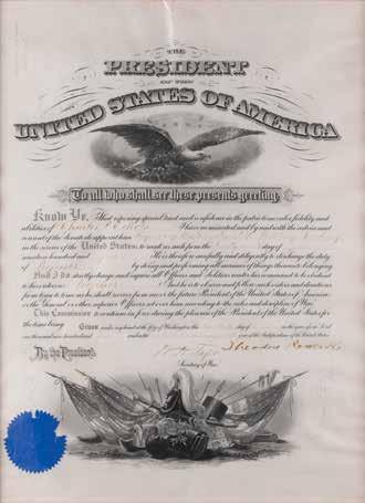15. Zachary Taylor Naval Commission Signed as President. Partly-printed vellum DS as president, signed “Z. Taylor,” one page, 11 x 8, September 26, 1849. President Taylor appoints Andrew F. Monroe as a “Passed Midshipman in the Navy of the United States.” Signed neatly at the conclusion by Zachary Taylor and countersigned by Secretary of the Navy William B. Preston. The lower left is embossed with the Navy Department seal. In fine condition, with light toning along the edges. Accompanied by an Atlantic Bank check from 1845, signed William Sinclair, Purser of the U.S. Navy, paying Monroe $37.50. Any Taylor presidential document is quite uncommon, as he served only 16 months before he died suddenly on July 9, 1850; this example remains in remarkable condition and boasts an ideally bold, crisp signature. Starting Bid $200