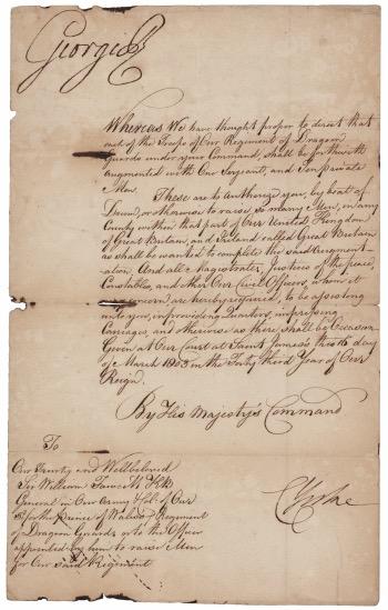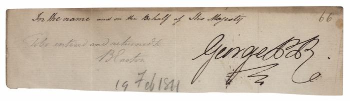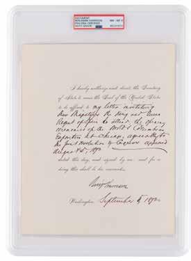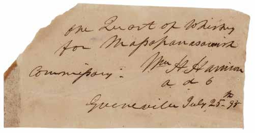11. William Henry Harrison Autograph Document Signed. ADS, signed “Wm. H. Harrison A.d.C.,” one page, 4.75 x 2.5, March 12, 1795. Request for one quart of whiskey for Native American Mashipinashiwish, signed by William Henry Harrison while serving as aide-de-camp at Fort Greenville. In very good to fine condition, with an old tape stain to the left edge. The Treaty of Greenville was signed on August 3, 1795, less than two weeks after Harrison submitted this document. The treaty was signed at Fort Greenville, one of the largest of the many wooden forts that troops built in Ohio to protect settlers and soldiers. Harrison was a signatory to the treaty, which brought peace and increased settlement to the area for more than a decade. Starting Bid $200