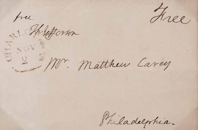 3. Thomas Jefferson Signed Free Frank to Mathew Carey. Hand-addressed and free franked address panel, 4.75 x 3.25, addressed in Jefferson’s hand to “Mr. Matthew Carey, Philadelphia,” and franked in the upper left, “free, Th: Jefferson.”