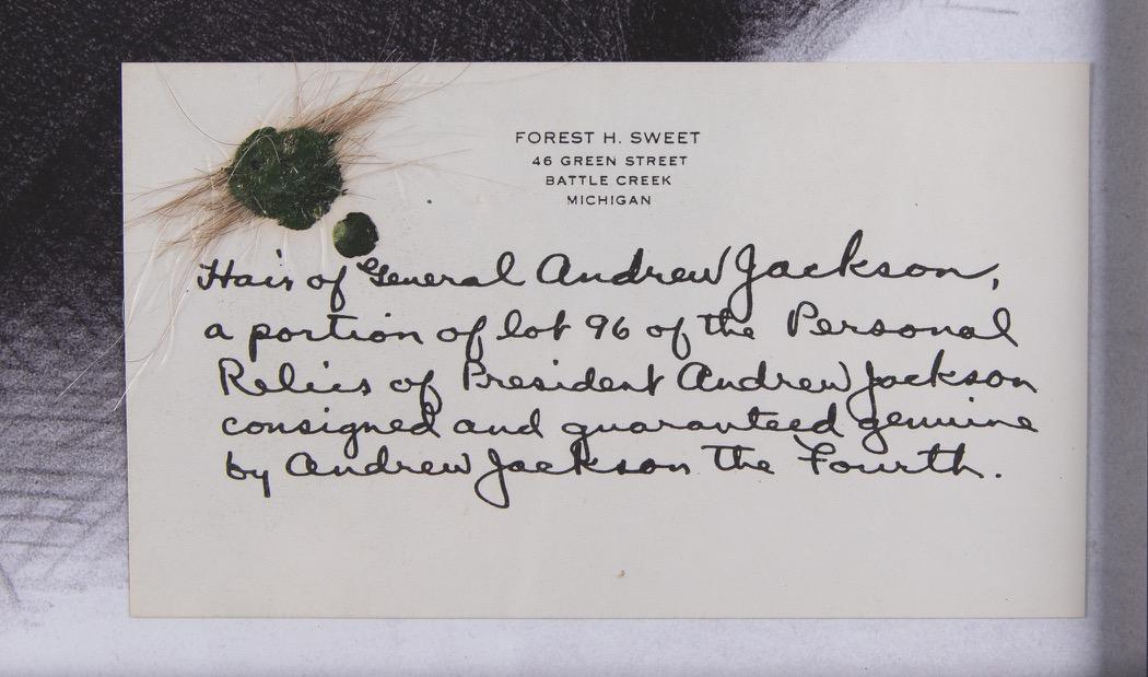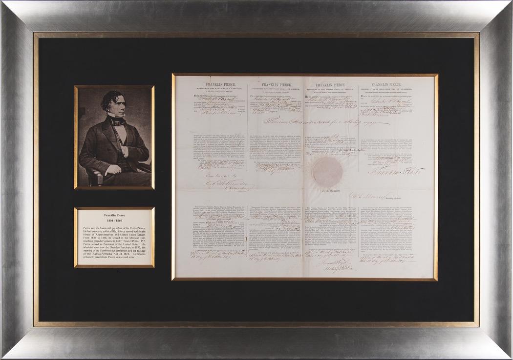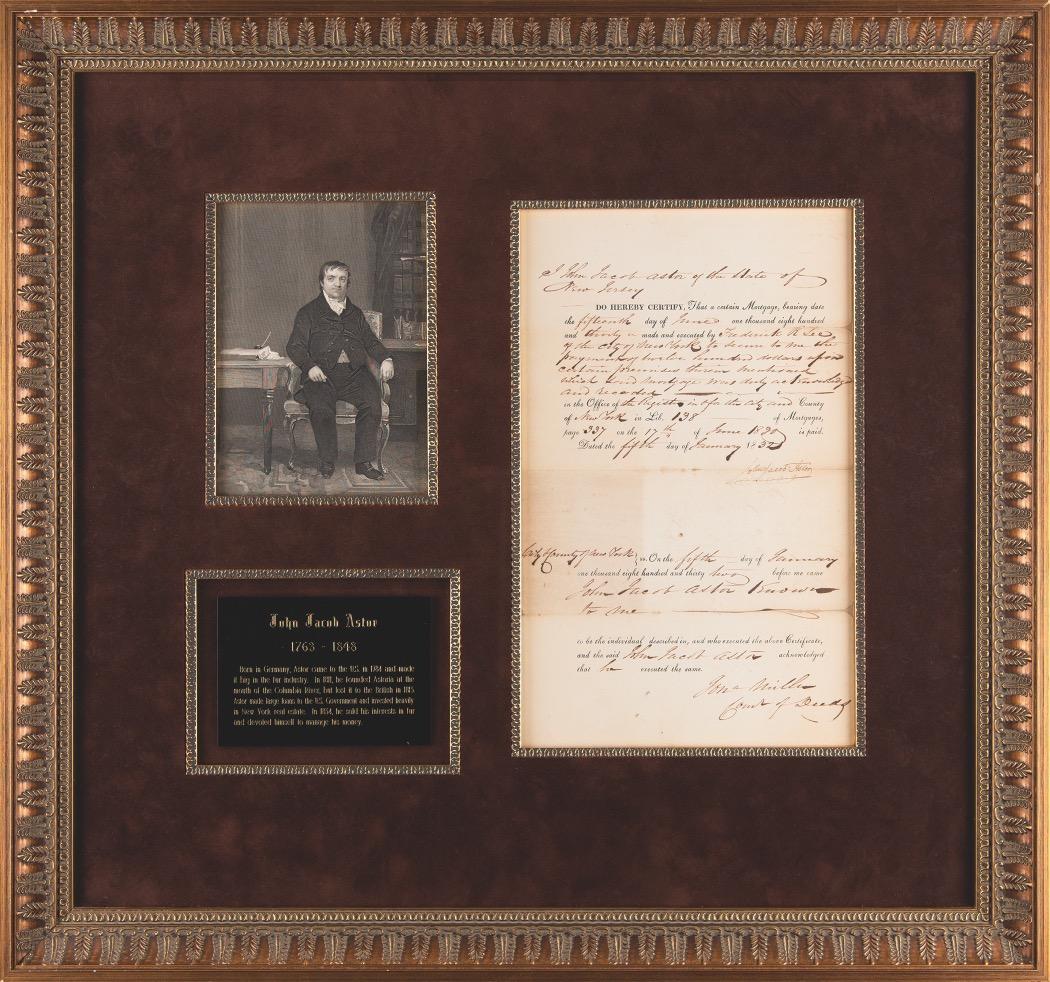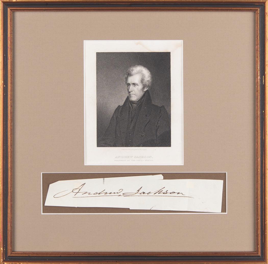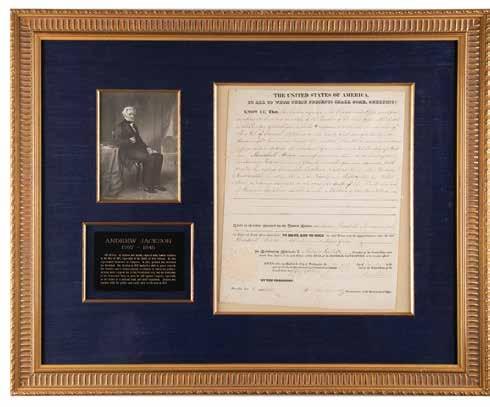 Signed as President. Partlyprinted vellum DS as president, one page, 11.75 x 14.75, October 12, 1830. President Jackson grants Marshall Moann a “tract of land containing Five acres…at Prairie du Chien” in the Michigan Territory. Prominently signed at the conclusion in ink by President Andrew Jackson and countersigned by the Acting Commissioner of the General Land Office. The white paper seal affixed at the lower left remains fully intact. Handsomely cloth-matted and framed with an engraved portrait and plaque to an overall size of 31.75 x 25.75. In fine condition, with one small hole touching one word of text. Starting Bid $200