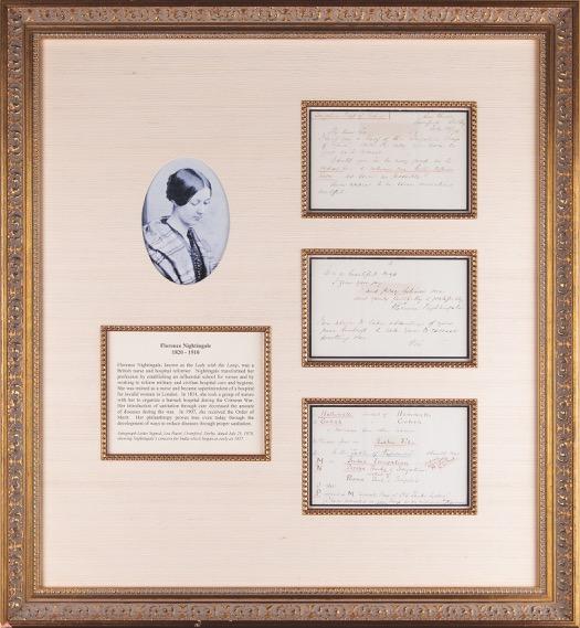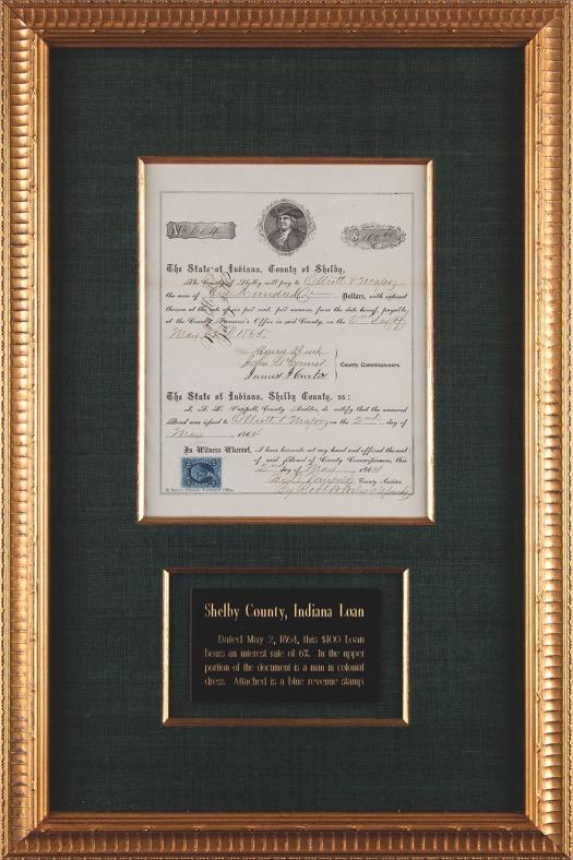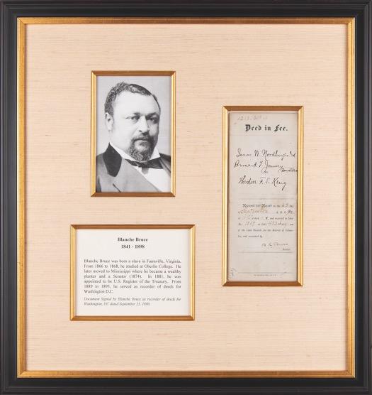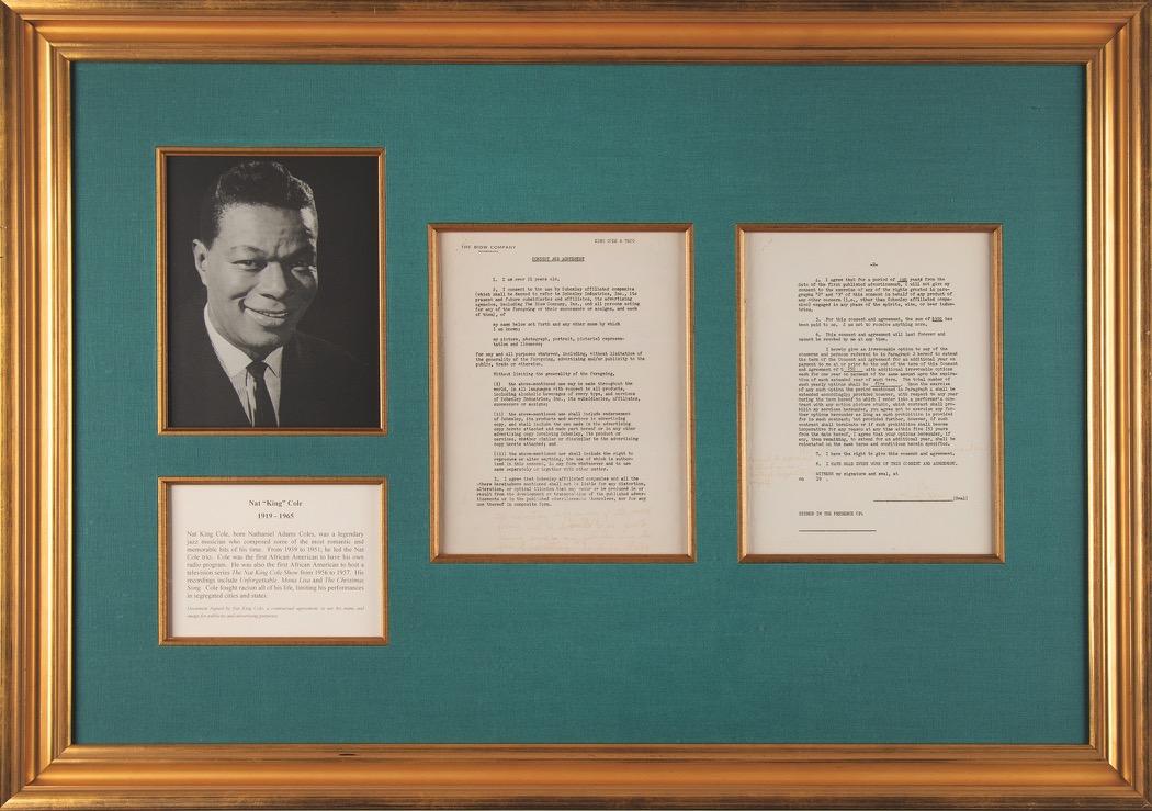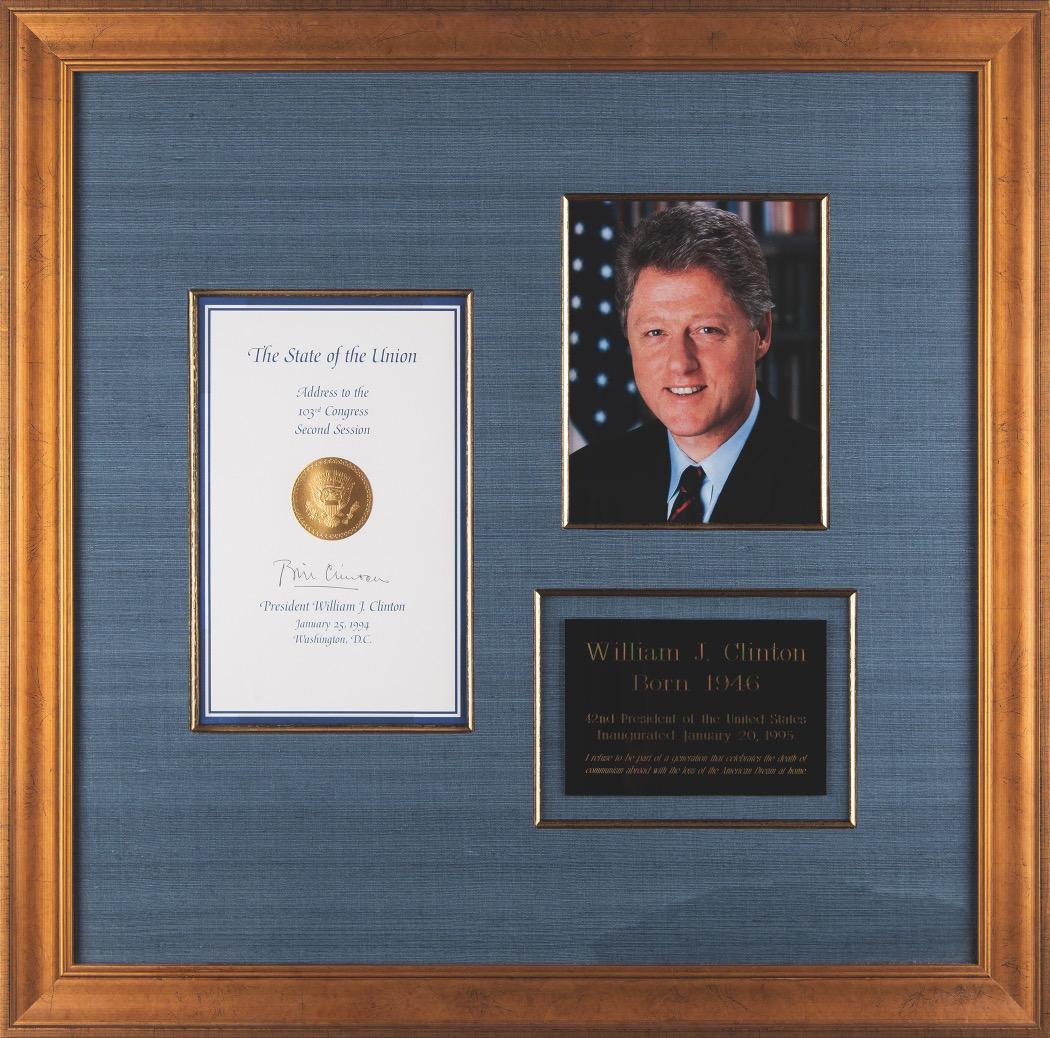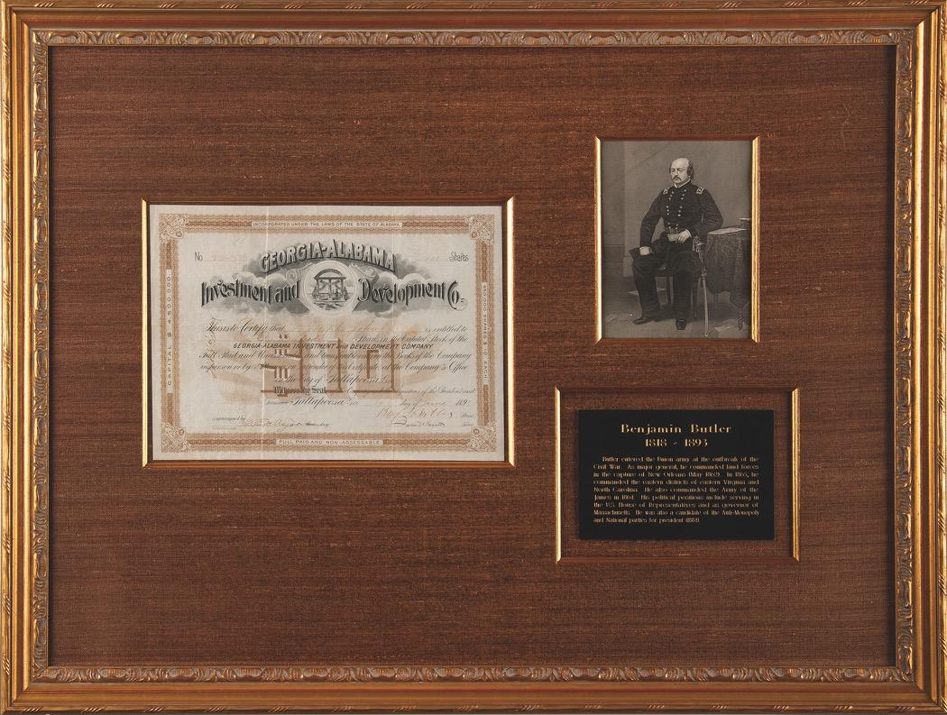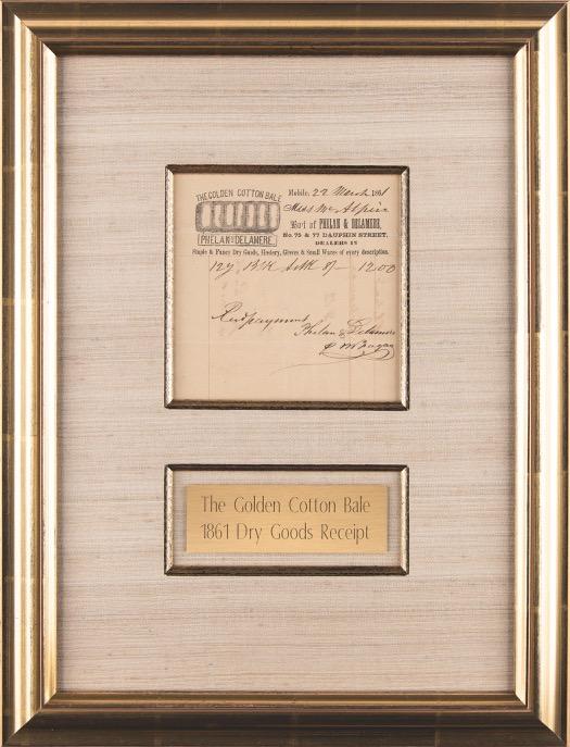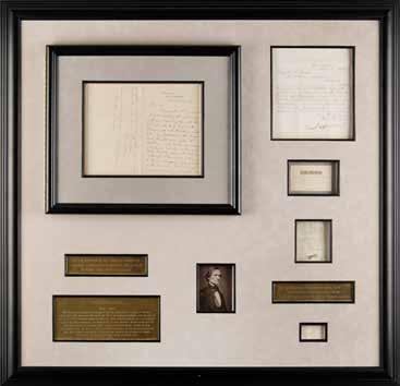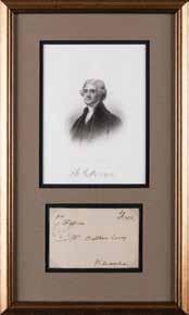2. George Washington Signature, Cloak Swatch, and Lock of Hair. Fantastic display consisting of a scarce full ink signature, “George Washington,” on an off-white 3.25 x 1 slip clipped from a larger document. Signature was part of a large March 17, 1769, indenture between Washington and Robert Thompson. Also included is a .5 x .75 swatch of Washington’s cloak from the family of Colonel Tobias Lear, Washington’s personal secretary and good friend; and six strands of Washington’s hair from the Custis-Powell family. All three items are nicely cloth matted and framed, with a color portrait of Washington and a descriptive plaque, to an overall size of 14.75 x 15.25. In very good condition, with staining to the slip, not affecting legibility of the signature. Complete Washington signatures are seldom seen. Accompanied by a provenance packet documenting the origin of the relics. Starting Bid $500