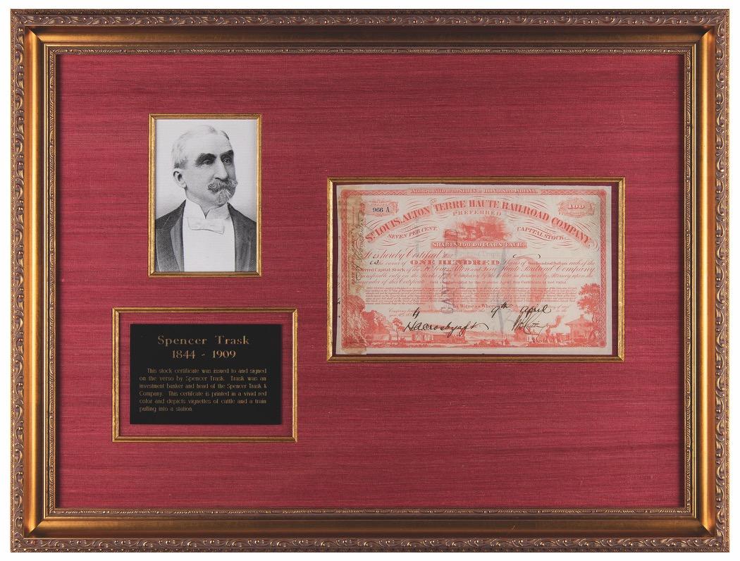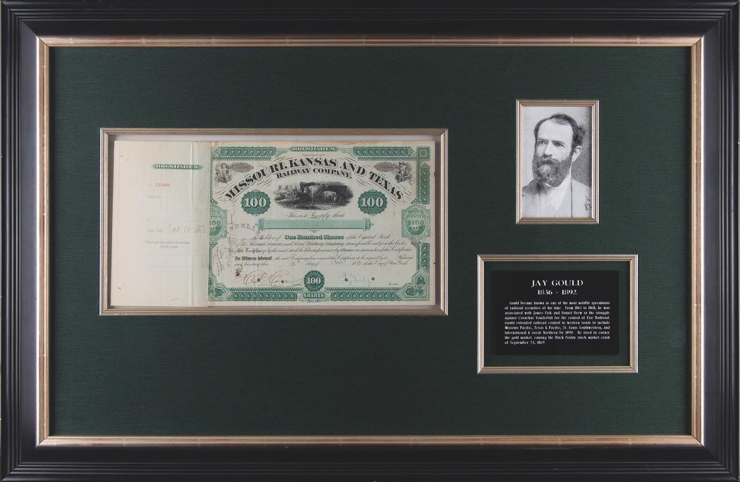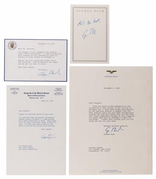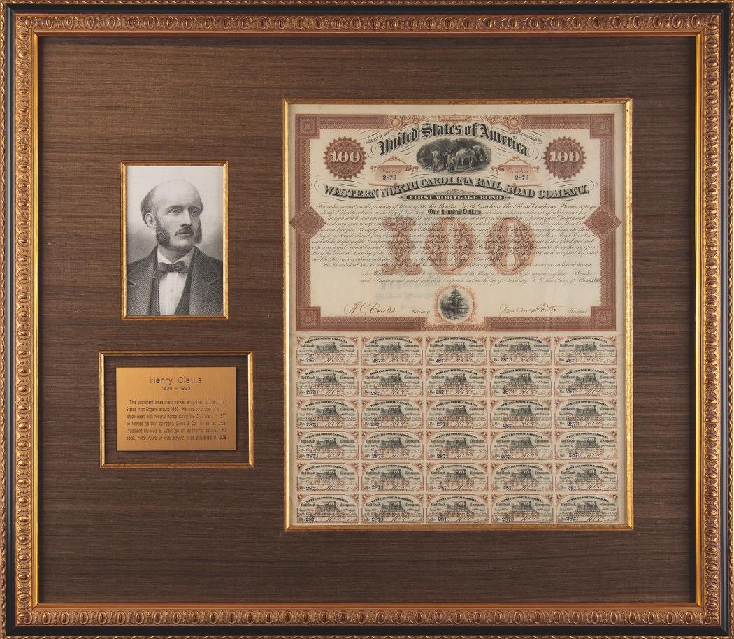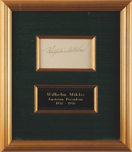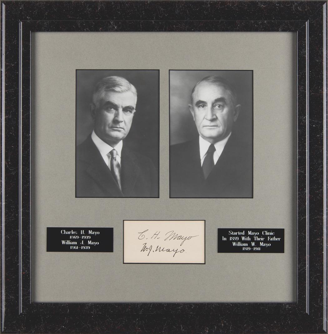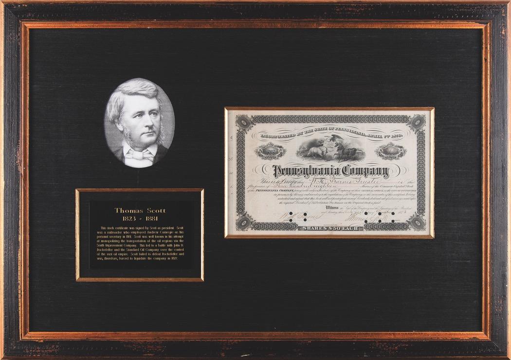 2. George Washington Signature, Cloak Swatch, and Lock of Hair. Fantastic display consisting of a scarce full ink signature, “George Washington,” on an off-white 3.25 x 1 slip clipped from a larger document. Signature was part of a large March 17, 1769, indenture between Washington and Robert Thompson. Also included is a .5 x .75 swatch of Washington’s cloak from the family of Colonel Tobias Lear, Washington’s personal secretary and good friend; and six strands of Washington’s hair from the Custis-Powell family. All three items are nicely cloth matted and framed, with a color portrait of Washington and a descriptive plaque, to an overall size of 14.75 x 15.25. In very good condition, with staining to the slip, not affecting legibility of the signature. Complete Washington signatures are seldom seen. Accompanied by a provenance packet documenting the origin of the relics. Starting Bid $500
