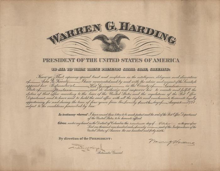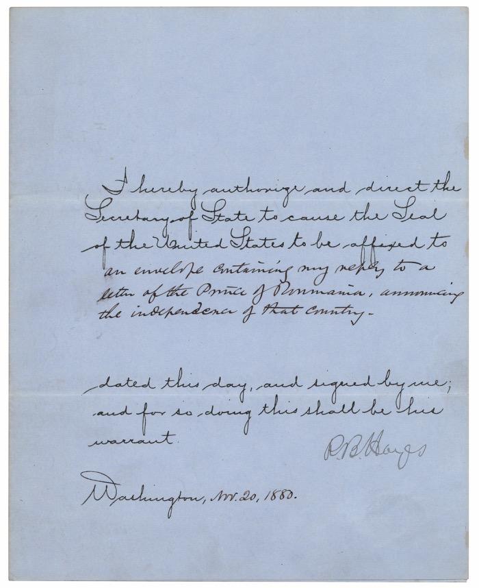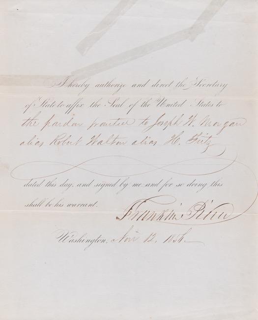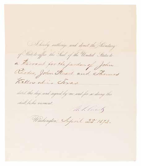 19. U. S. Grant Document Signed as President, Pardoning Three Robbers. Partly-printed DS as president, signed “U. S. Grant,” one page, 8.25 x 9.75, April 25, 1872. President Grant orders the Secretary of State to “to affix the Seal of the United States to a Warrant for the pardon of John Rhodes, John Stuart and Thomas Vickers alias Texas.” Neatly signed at the conclusion in purple ink by President Ulysses S. Grant. In fine condition, with light toning to the top third of the page. Starting Bid $200