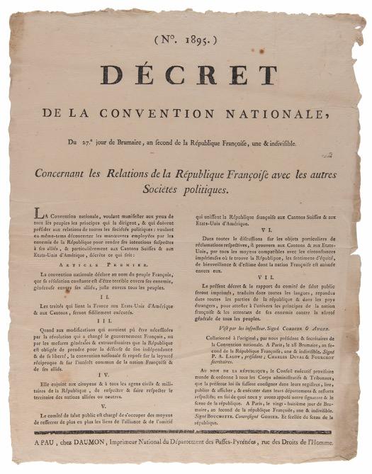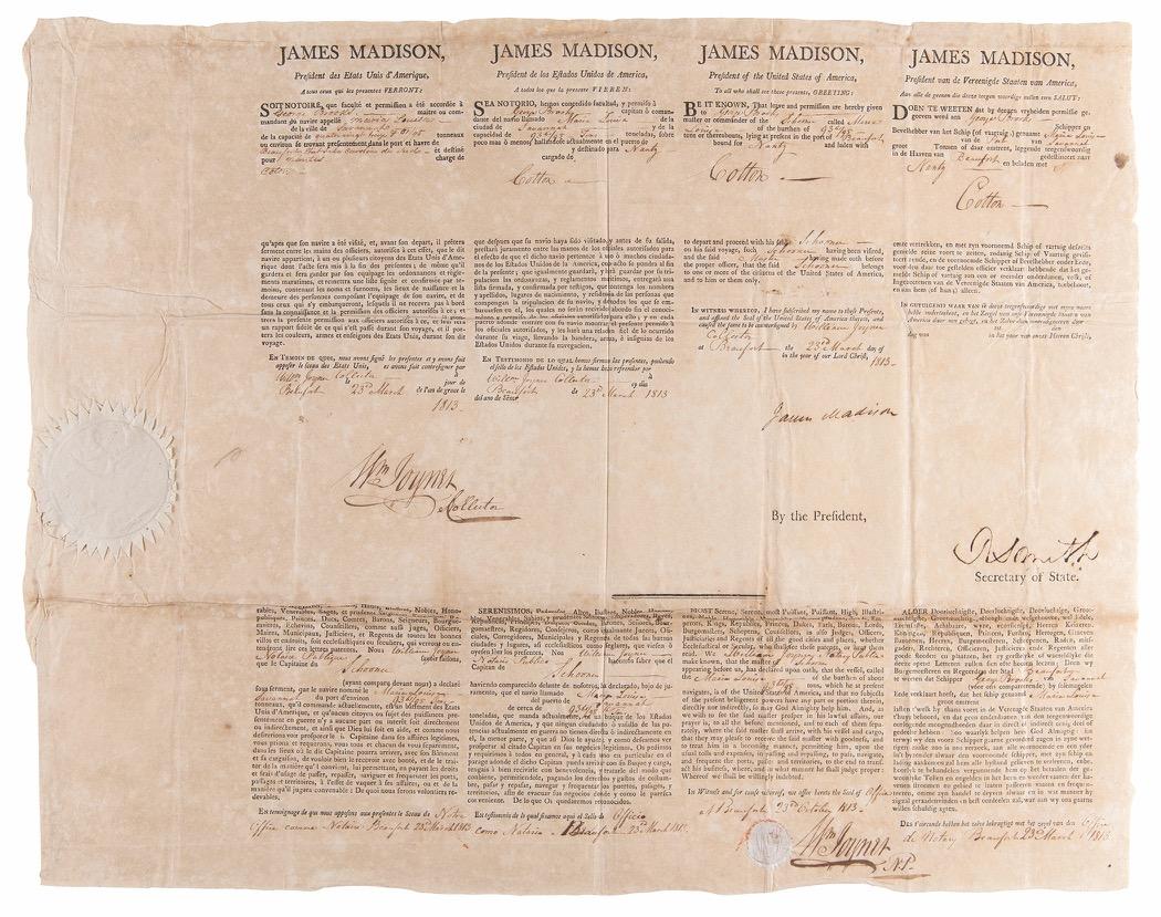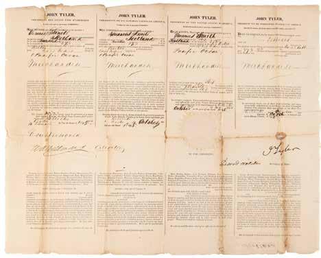 13. John Tyler and Daniel Webster Document Signed as President and Secretary of State. Partlyprinted DS, signed “J. Tyler” as president and “Dan’l Webster” as secretary of state, one page, 20.25 x 16.5, June 14, 1843. Four-language ship’s paper issued to “Varanus Smith, master or commander of the Ship called Scotland… lying at present in the port of Boston, bound for East Indies + Pacific Ocean and laden with Merchandise.” The Dutch-language section contains different ship information, indicating that the document was used, or attempted to be used, for two ships. Boldly signed by President John Tyler and countersigned by Secretary of State Daniel Webster. The middle portion retains the original white paper seal. In very good to fine condition, with staining, and small areas of paper loss, along the intersecting folds. Starting Bid $200