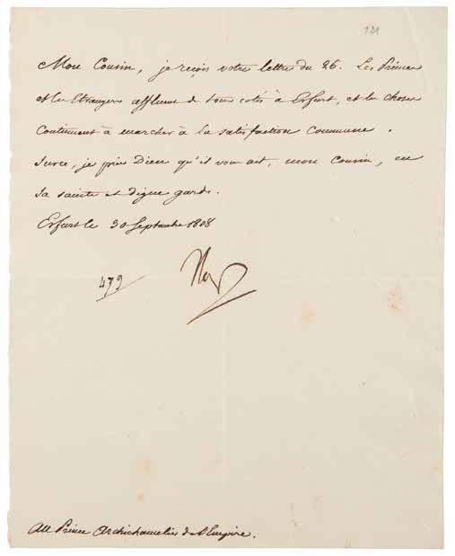 4. Dolley Madison Autograph Letter Signed. ALS signed “D. P. Madison,” one page, 7.75 x 9.5, October 4, 1833. Handwritten letter to “Richard,” in part: “I have been highly gratified by your letters, and ought to have thanked you for them long ago, but you are too well acquainted with the active life I lead not to forgive my delinquency—and too well assured of my true affection for you, to believe my silence proceeded from indifference to your correspondence. I rejoice at the recovery of Madison & his prospect of happiness—Dear Thomas & Lady I hope to be acquainted with before very long. You have returned to that excellent Institution, where advantages of every sort await the good and studious—a few years will bring you to some profession—You must tell your Unkle Madison or myself what you have fixed your mind upon as best suited to your views of independence and prosperity.” Beautifully cloth-matted and framed with a portrait and biographical caption to an overall size of 25 x 21. In fine condition. Starting Bid $200