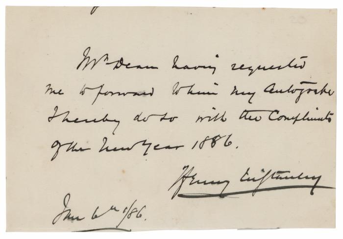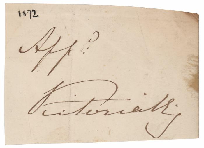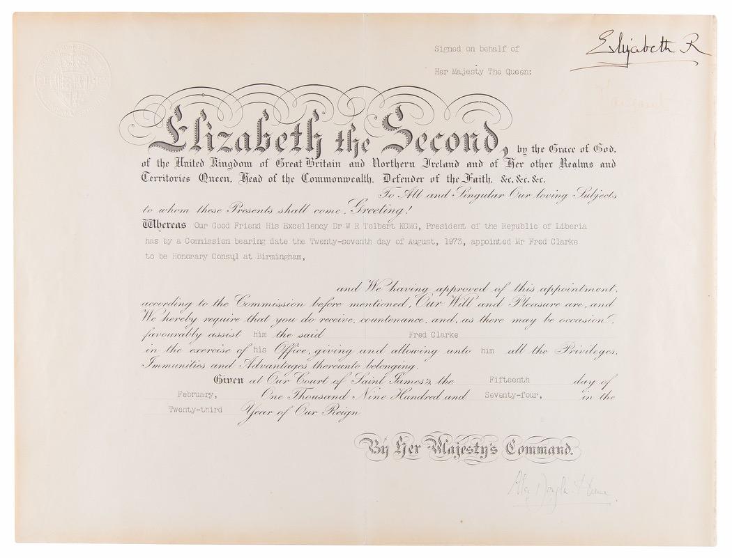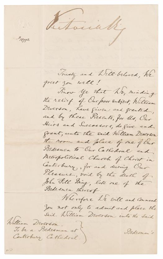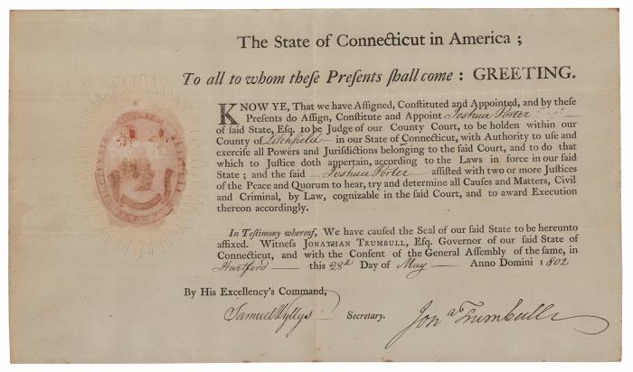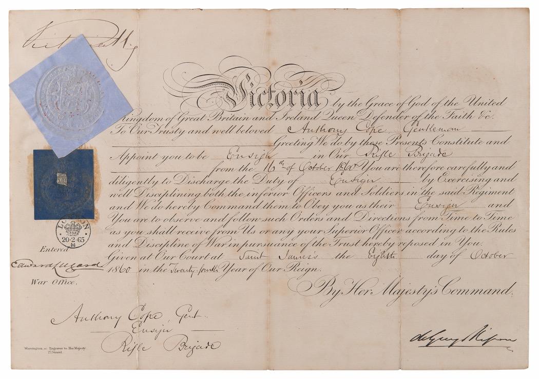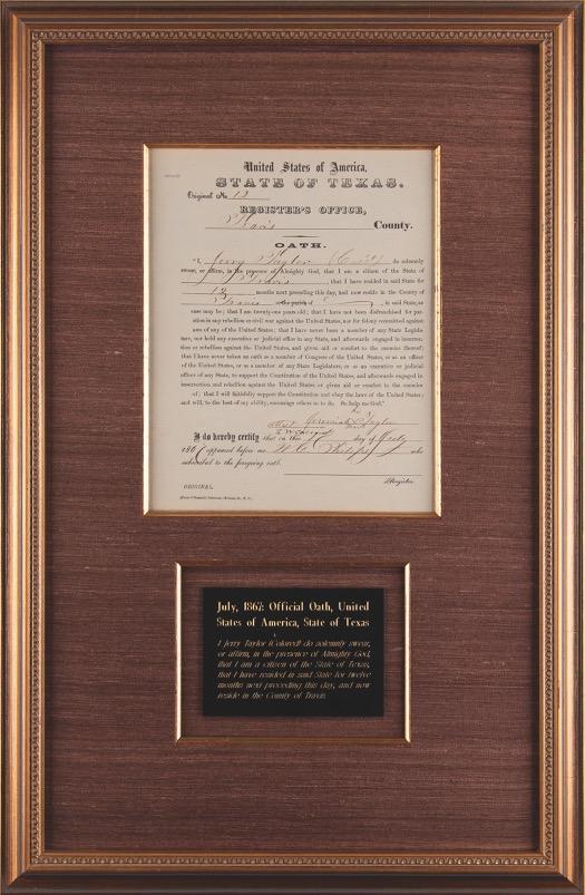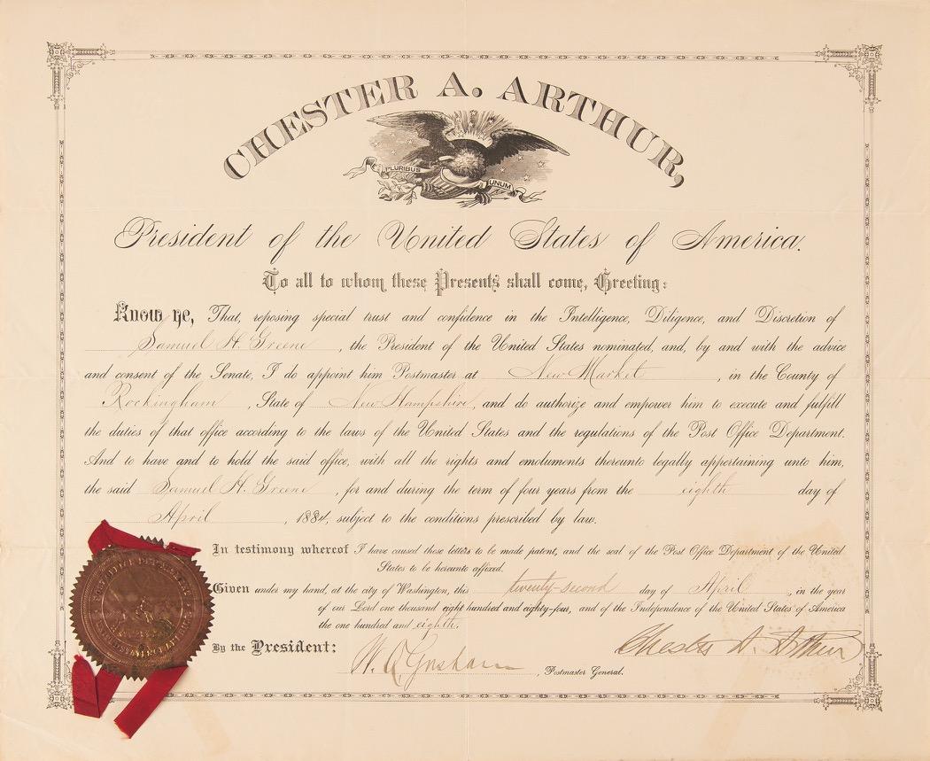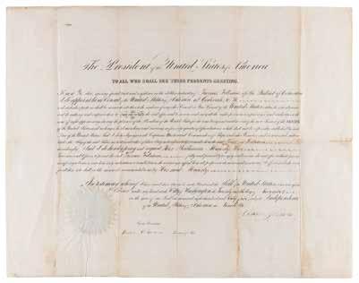 18. Andrew Johnson Document Signed as President. Partly-printed DS as president, one page, 22.5 x 18, November 29, 1865. President Johnson appoints Thomas Fitnam as “Consul of the United States of America at Goderich, C. W. [Canada West, the name of the province of Ontario from 1841 to 1867, before it became part of the Dominion of Canada].” Signed at the conclusion by Andrew Johnson and countersigned by Secretary of State William H. Seward. In very good to fine condition, with light toning along the intersecting folds, and repairs to fold splits and small areas of paper loss. Accompanied by an 1876 ALS from Fitnam to his son, written aboard the U.S. Consulate; a U.S Patent Office document issued to Fitnam for an improvement in “Life Preservers,” September 18, 1891; and two letters to Fitnam from Assistant Secretary of State Frederick W. Seward. Starting Bid $200