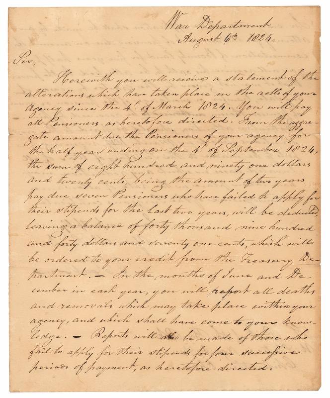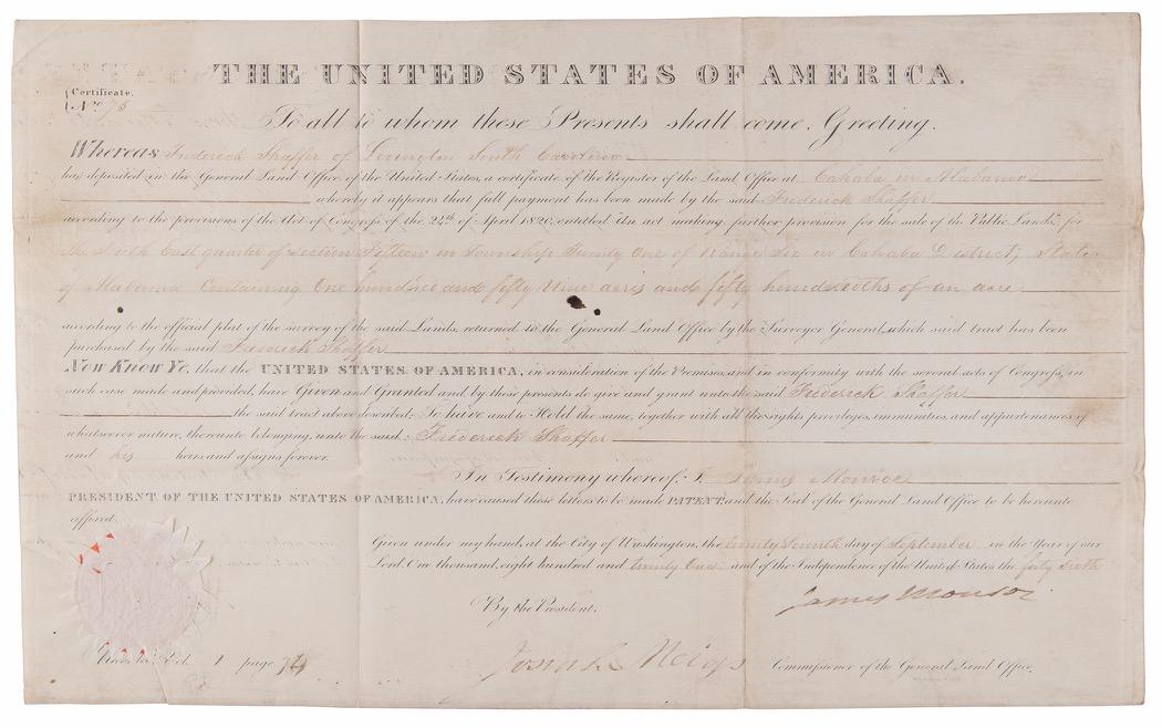 6. John Quincy Adams Document Signed as President. Partly-printed vellum DS as president, signed “J. Q. Adams,” one page, 15.25 x 9, September 1, 1826. President Adams grants Benjamin Roach a tract of land in Mississippi “containing Seventy nine acres.” Signed at the conclusion in ink by President John Quincy Adams and countersigned by Commissioner of the General Land Office George Graham. The white paper seal affixed at the lower left remains intact. In very good to fine condition, with some light staining and wrinkling at the center. Starting Bid $200