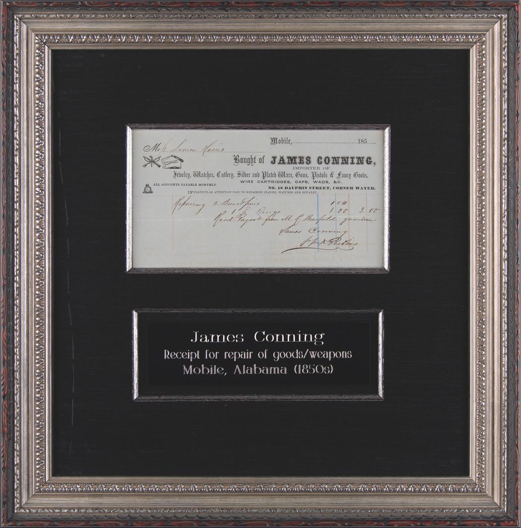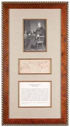 12. William Henry Harrison Document Signed. Manuscript DS, signed “Wm. H. Harrison A.d.C.,” one page, 6.5 x 3, March 12, 1795. Request for six rations of whiskey “for two spies” signed by William Henry Harrison while serving as aide-de-camp at Fort Greenville. Beautifully cloth-matted and framed with an engraved portrait and biographical caption to an overall size of 14.75 x 27. In fine condition. Starting Bid $200