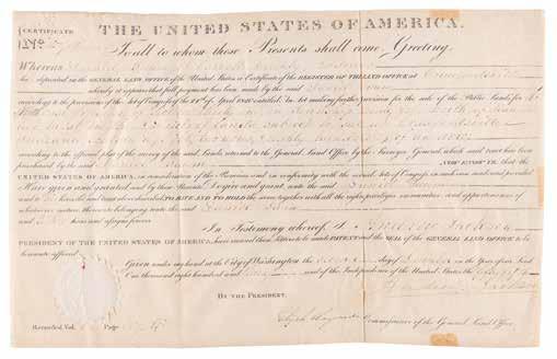 Signed as President. Partly-printed vellum DS as president, one page, 15.5 x 9.5, December 2, 1830. President Jackson grants David Baum a tract of land “at Crawfordsville, Indiana, containing Eighty two acres. Signed at the conclusion by President Andrew Jackson, and countersigned by Commissioner of the General Land Office Elijah Hayward. The white paper seal affixed at the lower left remains intact. In fine condition, with overall wrinkling and some old tape stains to the edges. Starting Bid $200