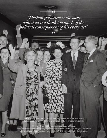 Jack Kennedy, father Joe Sr. at right and mother Rose at left, are surrounded by campaign supporters celebrating his June 18, 1946 primary victory win. The incredible 1946 Congressional images featured here, and many other rare photographic selections from the Ronnie Paloger Collection, will be offered in RR Auction’s May 18, 2017 JFK 100th Birthday Celebration.