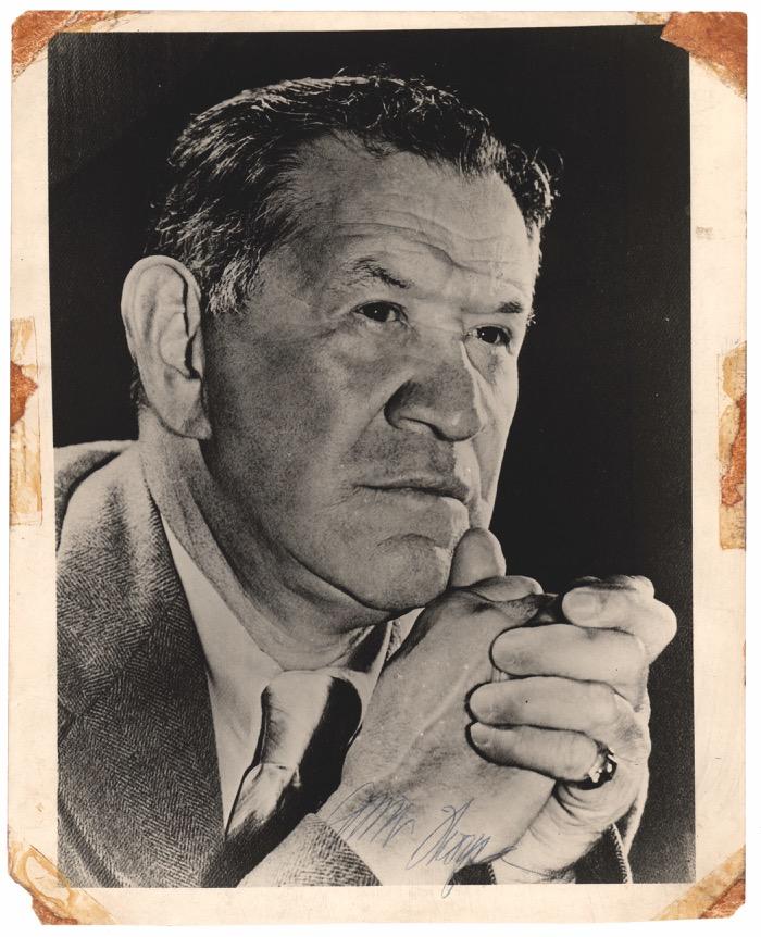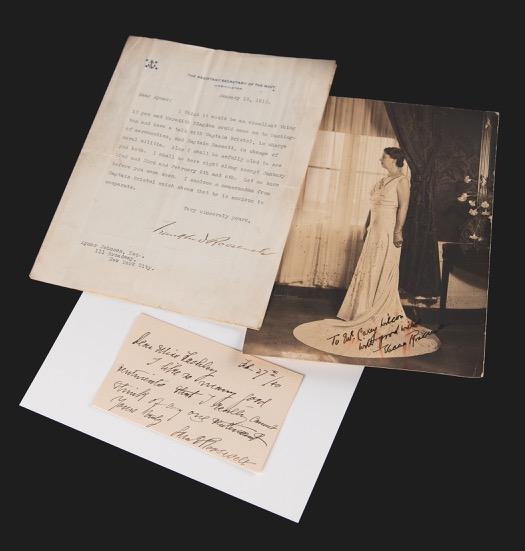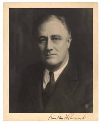 27. Franklin Roosevelt Signed Photograph. Vintage mattefinish 8 x 10 portrait photo of Franklin D. Roosevelt, signed on the lower border in fountain pen. Blindstamped in the lower right corner attributing the photograph to Pach Bros. In fine condition, with a few unobtrusive surface spots. Starting Bid $200