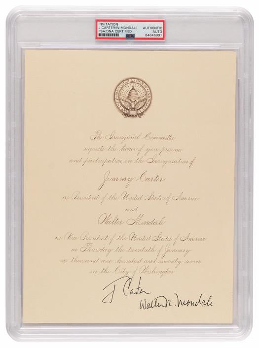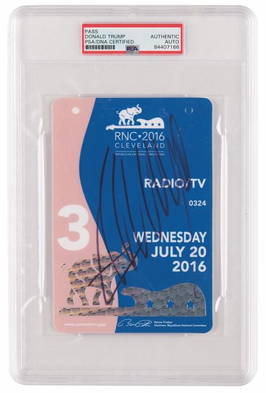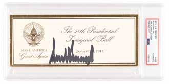 38. Donald Trump Signed Inaugural Ball Ticket. Original 7.5 x 3 gold-bordered ticket to “The 58th Presidential Inaugural Ball” held on January 20, 2017, prominently signed along the bottom in thick black felt tip by Donald Trump. The elegant off-white ticket is gilt-stamped with the seal of the 2017 inauguration and Trump’s memorable campaign slogan: “Make America Great Again.” In very fine condition. Encapsulated in a PSA/DNA authentication holder. Starting Bid $200