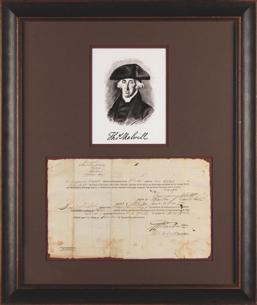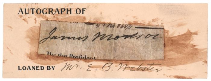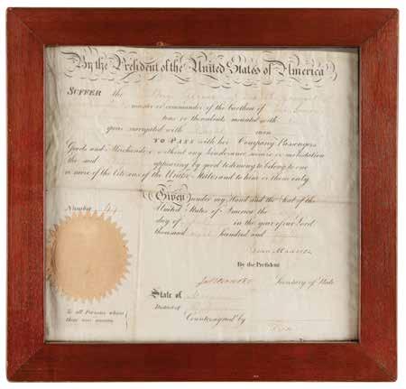 Partly-printed vellum DS, signed “James Madison” as president and “Jas. Monroe” as secretary of state, one page, 10 x 9.5, July 3, 1815. Lower section of a ship’s pass issued to the “Brig Gleaner…To Pass with her Company Passengers Goods and Merchandize without any hinderance seisure or molestation.” Signed at the conclusion by President James Madison and Secretary of State James Monroe. The paper seal affixed to the lower left remains intact. Framed to an overall size of 12.5 x 12. In very good to fine condition, with the upper portion of the document trimmed off, and the handwritten portions of text faded but legible; Madison and Monroe signatures are bold, although the “J” in Madison’s first name is extremely faint. From the collection of Howard Reiche. Starting Bid $200