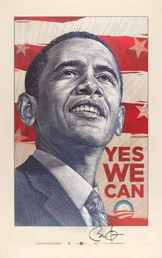 36. Barack Obama Signed 2008 Campaign ‘Yes We Can’ Lithograph by Antar Dayal. Wonderful color 25 x 39.5 lithograph of artist Antar Dayal’s iconic ‘Yes We Can’ poster for the 2008 presidential campaign of Barack Obama, depicting the eventual 44th POTUS against a stars and stripes background, with the lower right featuring Obama’s campaign logo and large red lettering “YES WE CAN,” signed prominently in the lower border in black felt tip by Obama. The poster is also signed in pencil by the poster’s artist. Rolled and in fine condition. Starting Bid $200