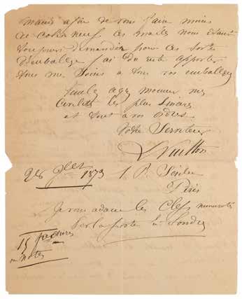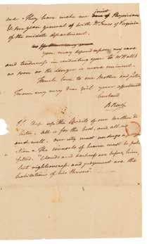 131. George Clymer Autograph Letter Signed. Signer of the Declaration of Independence from Pennsylvania (1739–1813) who served as the first president of the Philadelphia Bank. ALS signed “Geo. Clymer,” three pages on two adjoining sheets, 7.25 x 9, June 9, 1784. Handwritten letter to John Montgomery, in part: “The description accompanying this is of a tract of land belonging to me in the Path Valley Cumberland County which I am inclined to sell...You will oblige me in learning its value…Your information on this subject under cover to Mr. Fitzsimons will reach me at Princeton.” The integral third page bears Clymer’s handwritten description of said land tract of “Two hundred and sixty five acres.” The letter is affixed by its back left edge to a slightly larger sheet. In fine condition, with writing showing through from opposing sides. From the collection of Howard Reiche. Starting Bid $200