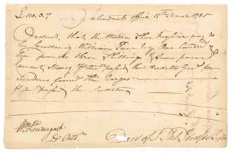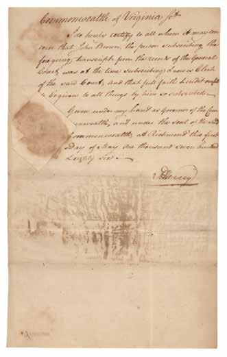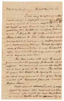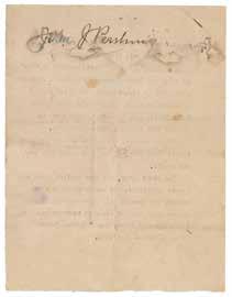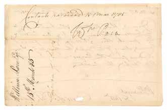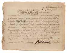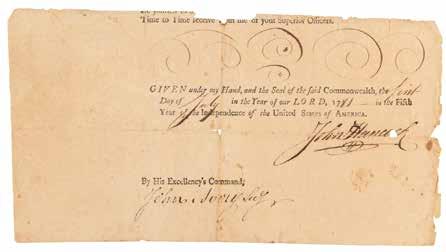 137. John Hancock War-Dated Signature as Massachusetts Governor (1781). Revolutionary Wardated ink signature as governor of Massachusetts, “John Hancock,” on an off-white 11 x 5.75 sheet clipped from a partlyprinted military document dated July 1, 1781, and countersigned by Secretary John Avery. In very good to fine condition, with a fold split, and a small area of paper loss, affecting Hancock’s boldly signed last name. Accompanied by an engraved portrait with a facsimile signature. From the collection of Howard Reiche. Starting Bid $200