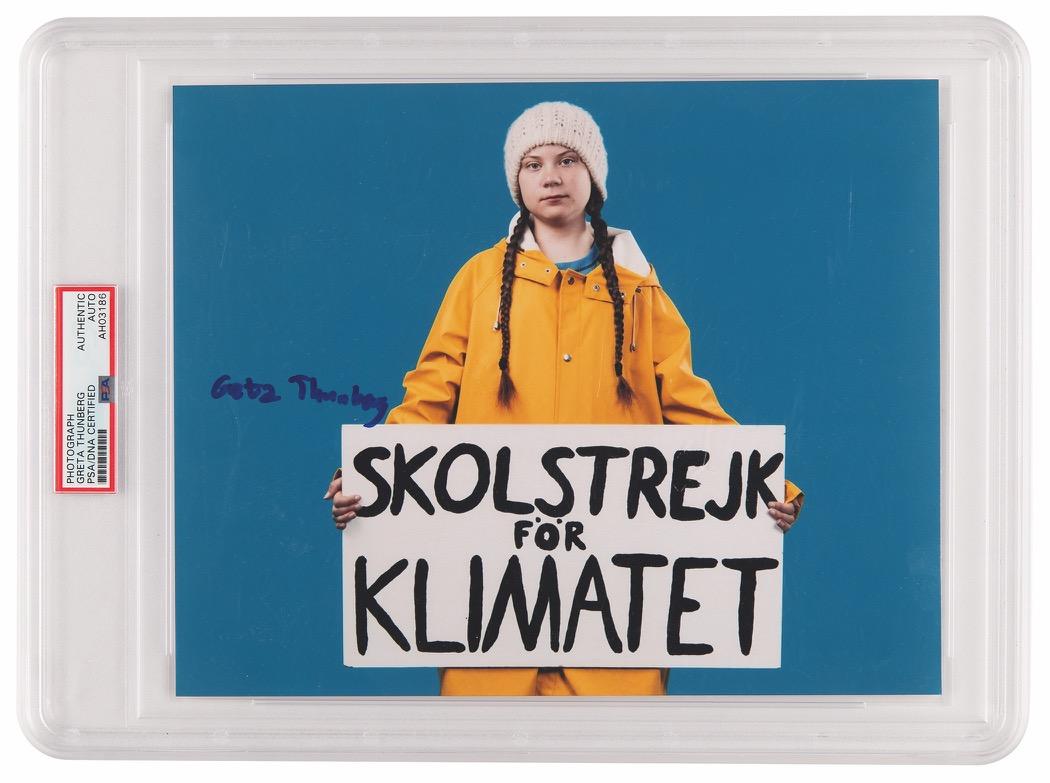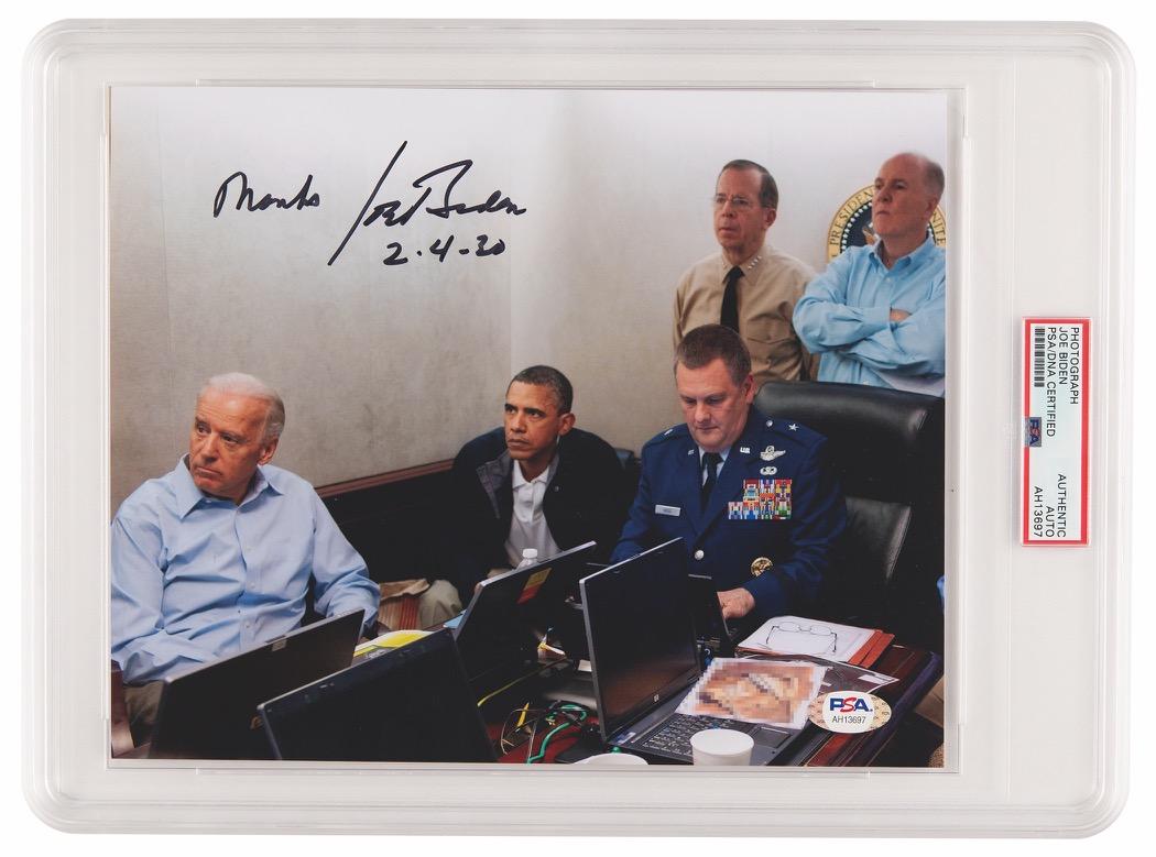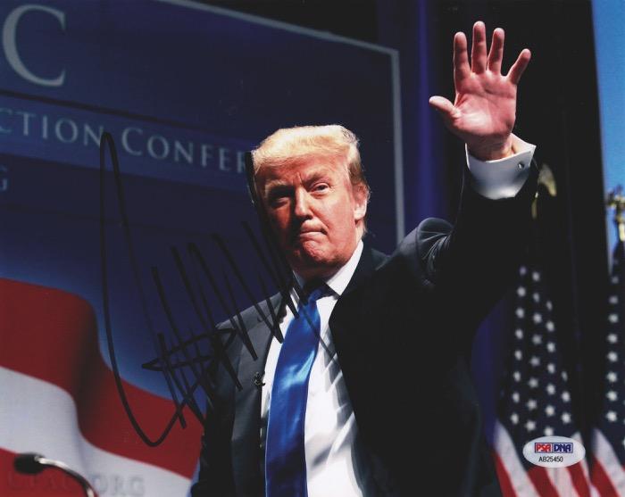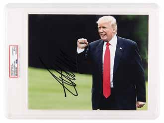 39. Donald Trump Signed Photograph. Color satinfinish 10 x 8 photo of President Donald Trump enthusiastically pumping his fist on the White House lawn in June 2017, signed in black felt tip. In very fine condition. Encapsulated in a PSA/ DNA authentication holder. Starting Bid $200