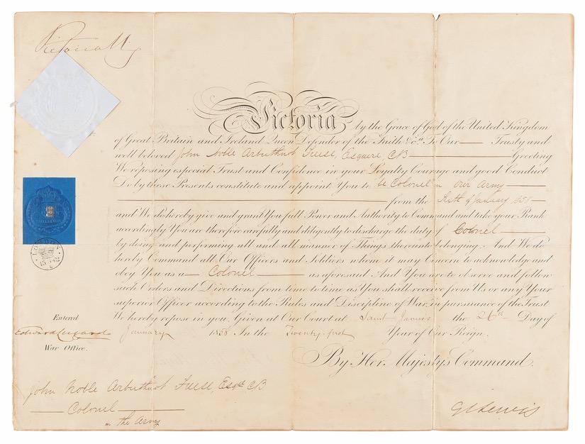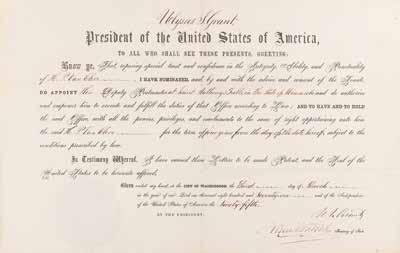 17. U. S. Grant Document Signed as President. Partly-printed DS as president, one page, 17.75 x 11.25, March 3, 1871. President Grant appoints H. P. Van Cleve to be “Deputy Postmaster at Saint Anthony’s Falls in the State of Minnesota.” Signed at the conclusion by President Ulysses S. Grant and countersigned by Secretary of State Hamilton Fish. The white paper seal affixed at the lower left remains fully intact. In fine condition. Horatio Phillips Van Cleve (1809-1891) served in the Union Army throughout the Civil War, rising from the rank of colonel with the Minnesota Volunteers to general in command at Murfreesboro, Tennessee. He saw action at the Battle of Logan’s Cross Roads, participated in the Siege of Corinth, was wounded at Stone’s River, and fought at the Battle of Chickamauga. Starting Bid $200