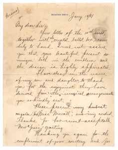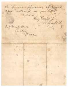 19. James A. Garfield Letter Signed as President-Elect. LS as president-elect, signed “J. A. Garfield,” one page both sides, 8 x 10.25, personal Mentor, Ohio letterhead, January 15, 1881. Marked “Personal,” a letter to composer and pianist Ernst Perabo, in part: “Your…crystal ballet box, came duly to hand. I need not assure you that your beautiful present so unique both in the emblem and the design is highly appreciated.” In very good condition, with toning, staining, and splitting along the folds. From the collection of Howard Reiche. Starting Bid $200