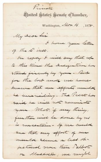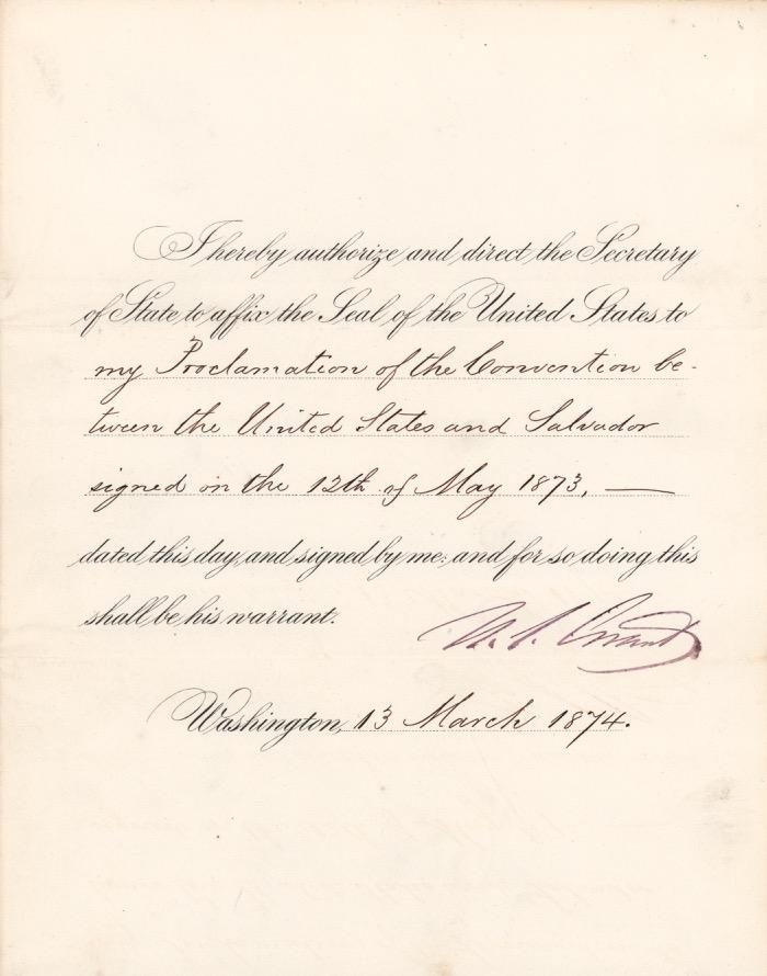 18. Rutherford B. Hayes Document Signed as President, Recalling a Diplomat from Belgium. Partly-printed DS as president, signed “R. B. Hayes,” one page, 8 x 10, February 1, 1881. President Hayes directs the Secretary of State to cause the Seal of the United States to be affixed to “an envelope containing my letter in reply to the letter of the King of the Belgians, recalling Mr. Delfosse from his mission as Envoy Extraordinary and Minister Plenipotentiary of His Majesty in Washington.” Signed at the conclusion by Rutherford B. Hayes. In fine condition. Starting Bid $200
