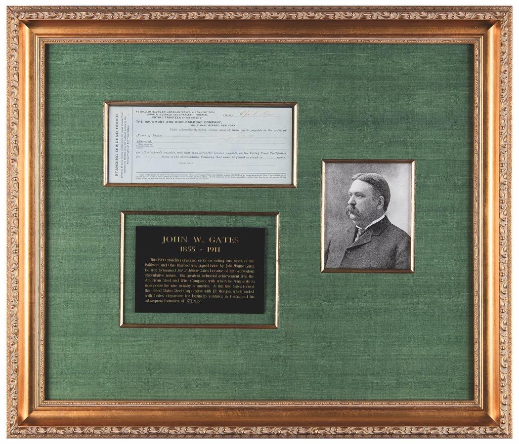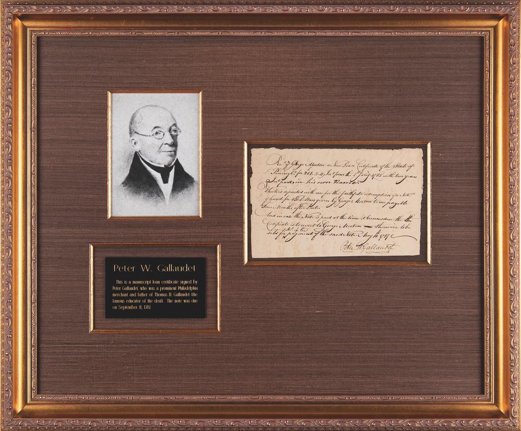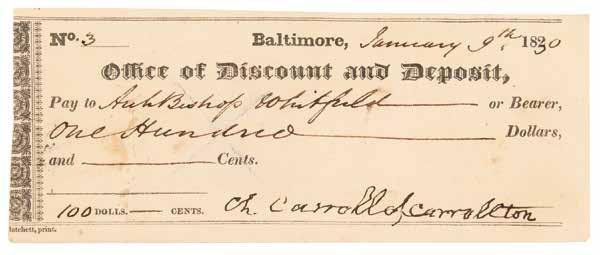 130. Charles Carroll of Carrollton Signed Check. Signer of the Declaration of Independence from Maryland (1737-1832) who was the longest-lived among his colleagues. Office of Discount and Deposit check, 6.5 x 2.75, filled out in another hand and signed by Carroll, “Ch. Carroll of Carrollton,” payable to Archbishop Whitfield for $100, January 9, 1830. In fine condition. James Whitfield (born 1770) was an English-born prelate of the Roman Catholic Church in the United States who served as archbishop of the Archdiocese of Baltimore in Maryland from 1828 until his death in 1834. Whitfield is known for hosting the first two provincial councils of American bishops, where policies for running the new American Catholic Church were established. From the collection of Howard Reiche. Starting Bid $200