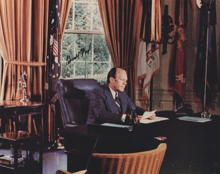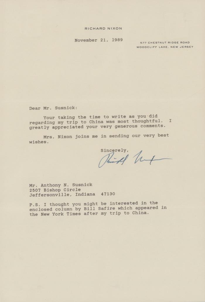 34. Ronald Reagan Autograph Letter Signed to His Press Secretary. ALS signed “Ron,” one page, 6.5 x 8.5, personal letterhead, November 1, 1989. Handwritten letter to Nancy Clark Reynolds, his former press secretary and special assistant, in part: “Thank you for the book…Now about my hair! I can’t get over it. Every place I go & almost everyone I meet — especially you gals tell me to have it short that I look much younger this way. Now that’s tempting — do I or don’t I. I must say there is an advantage in the mornings — not having anything to comb.” In very fine condition. Accompanied by the original hand-addressed envelope, which bears Reagan’s printed franking signature. Starting Bid $200