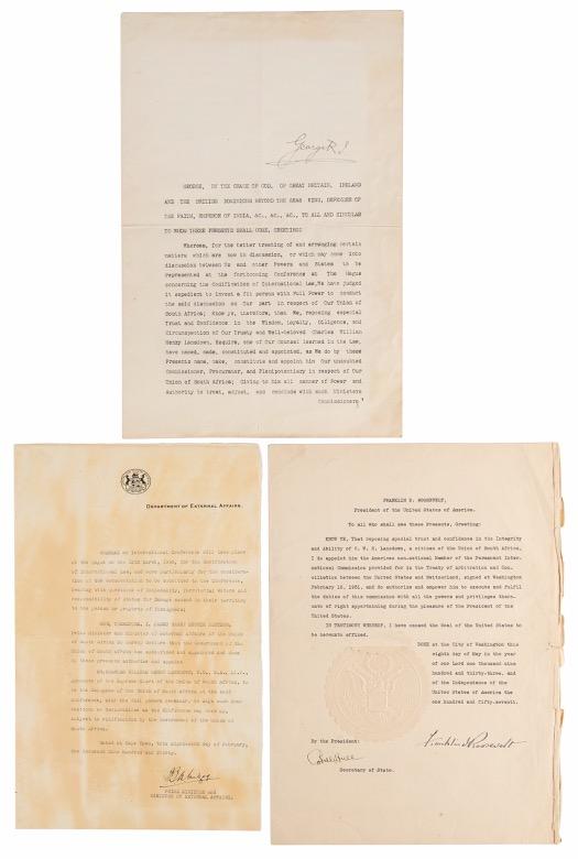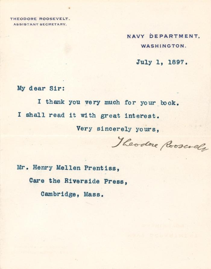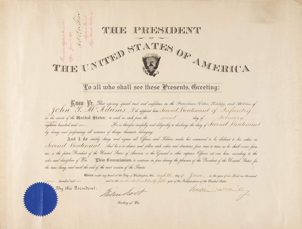 25. Theodore Roosevelt Document Signed as President. Partly-printed vellum DS as president, one page, 15.75 x 19.75, December 26, 1901. President Roosevelt appoints John P. McAdams as a “Second Lieutenant of Infantry in the service of the United States.” Signed boldly at the conclusion by Theodore Roosevelt and countersigned by Secretary of War Elihu Root. The embossed blue War Office seal remains affixed to the lower left. Rolled and in fine condition. Starting Bid $200