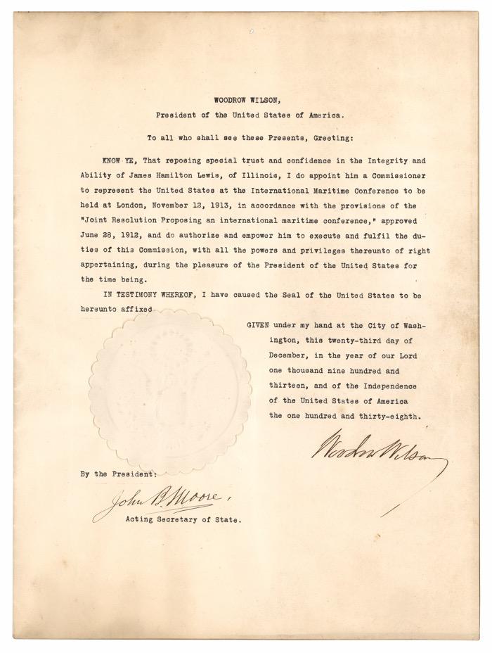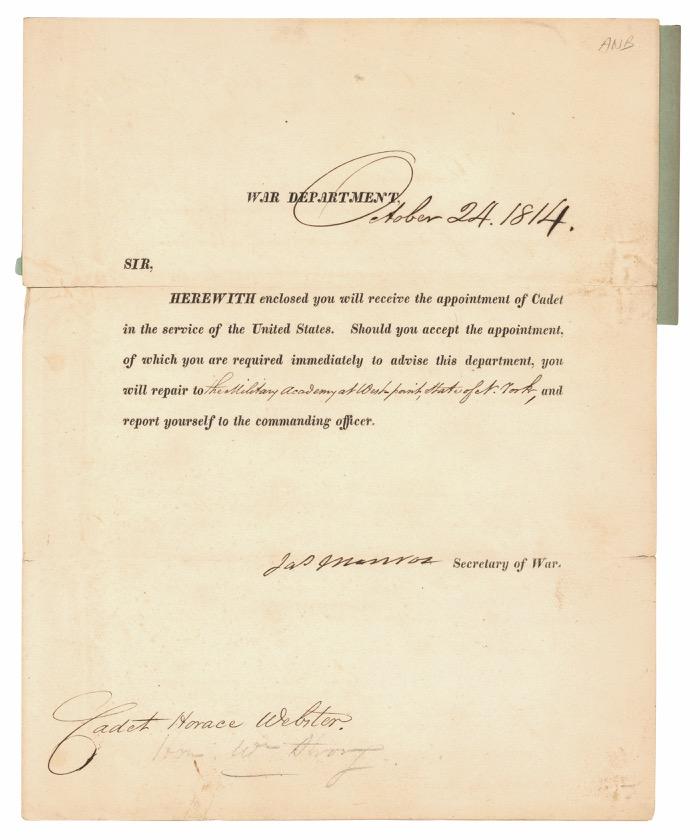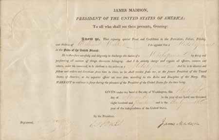 5. James Madison Document Signed as President. Partly-printed vellum DS as president, one page, 12.5 x 8, November 30, 1814. President Madison appoints William Walker as “a Midshipman in the Navy of the United States.” Signed at the conclusion in ink by President James Madison and countersigned by Secretary of the Navy William Jones. Framed and in fine condition. From the collection of Howard Reiche. Starting Bid $200