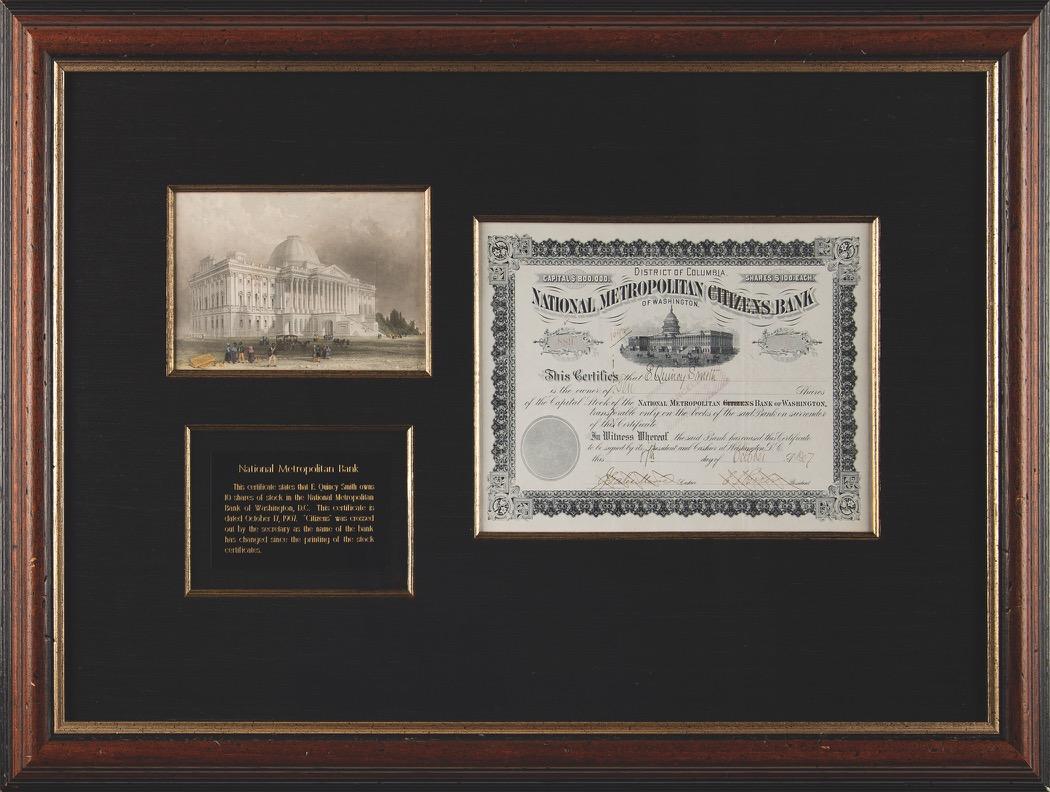 The property was consumed by fire when Washington burned during the War of 1812, and the lot and charred remains of the building were purchased for a mere $1,446. The buildings were restored into a larger hotel in the mid-19th century, but razed in the early 20th. Today, there stands a plaque marking their place: ‘Here were the lots acquired on October 3, 1798 by General George Washington and on which he built two brick dwellings from designs by Dr. William Thornton. A dwelling remodeled from the two dwellings was owned and occupied by Admiral Charles Wilkes, the famous explorer.’ From the collection of Howard Reiche. Starting Bid $2500