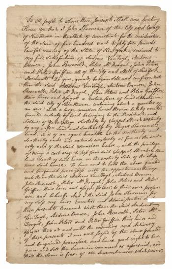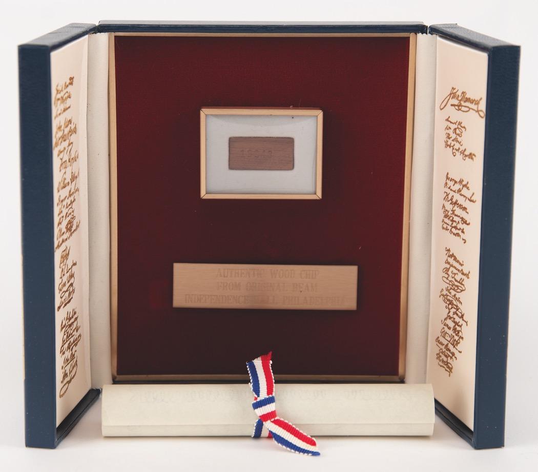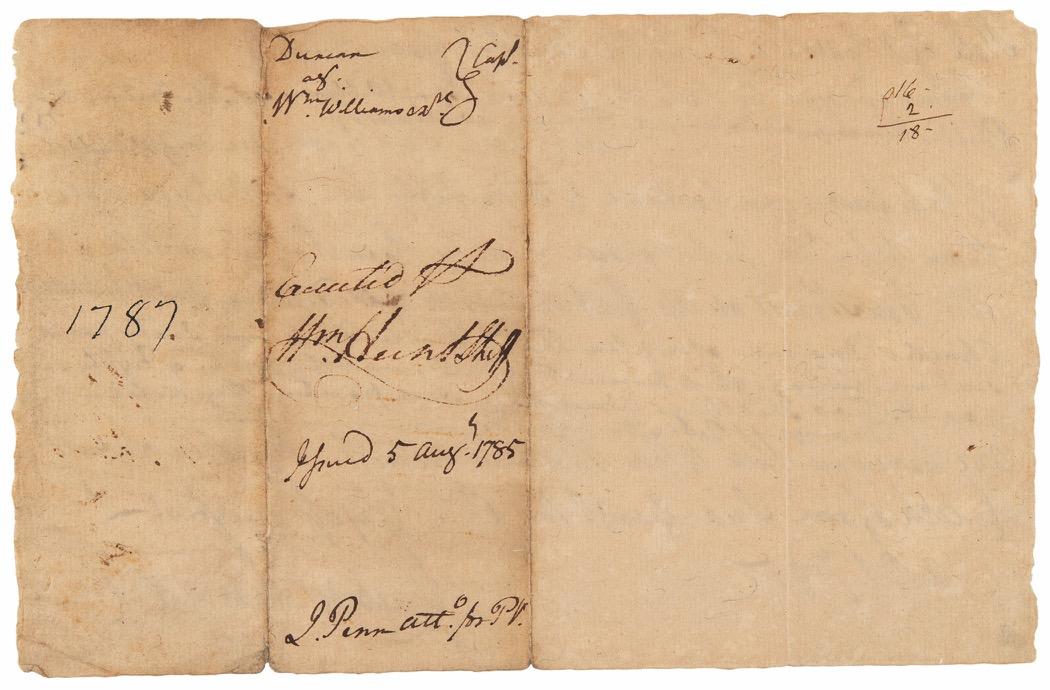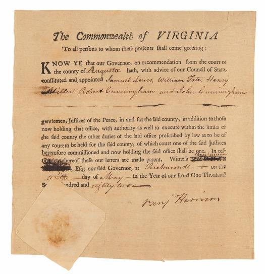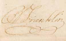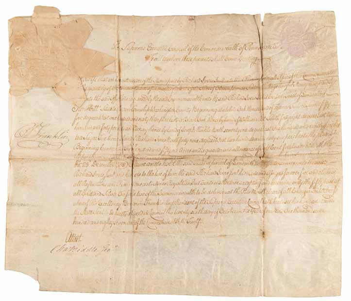134. Benjamin Franklin Signed Land Grant as President of Pennsylvania’s Supreme Executive Council (1787). Manuscript vellum DS, signed “B. Franklin,” one page, 15.25 x 12.75, October 26, 1787. As president of Pennsylvania’s Supreme Executive Council, Franklin issues a land grant to Richard Ivers for “a Certain Tract of Land called ‘Iron Hill’ Situate in Green Township Washington County…Containing Two hundred and fifty six Acres and a quarter.” Signed prominently on the left side by Benjamin Franklin, and countersigned below by Charles Biddle as secretary. The upper left retains the original paper state seal of Pennsylvania. In very good condition, with overall creasing, light soiling, loss to the lower left corner, and minor loss along the intersecting folds; Franklin’s signature is clean and unaffected. Accompanied by an engraved portrait bearing a facsimile signature. Franklin issued this document as president of the Supreme Executive Council of Pennsylvania, a position analogous to the modern position of governor. From the collection of Howard Reiche. Starting Bid $1000