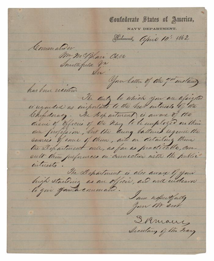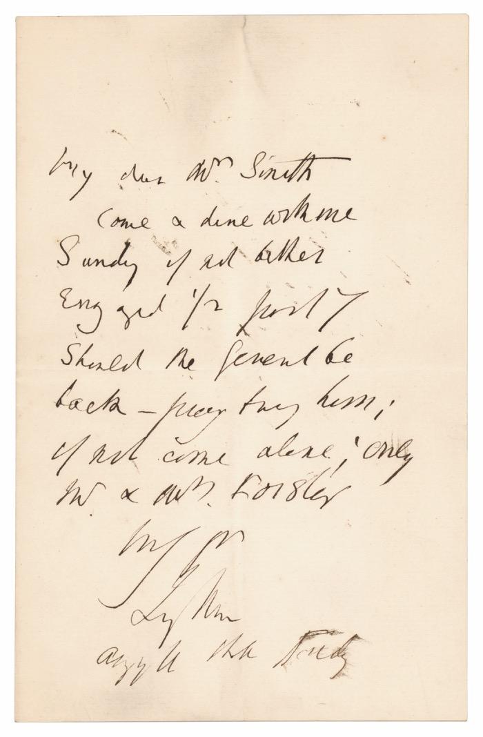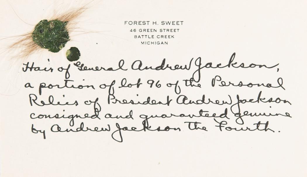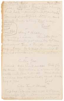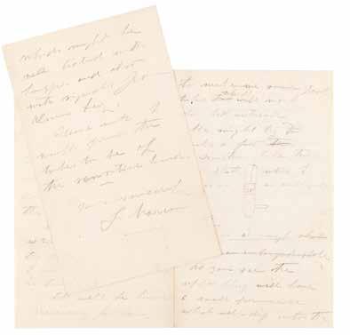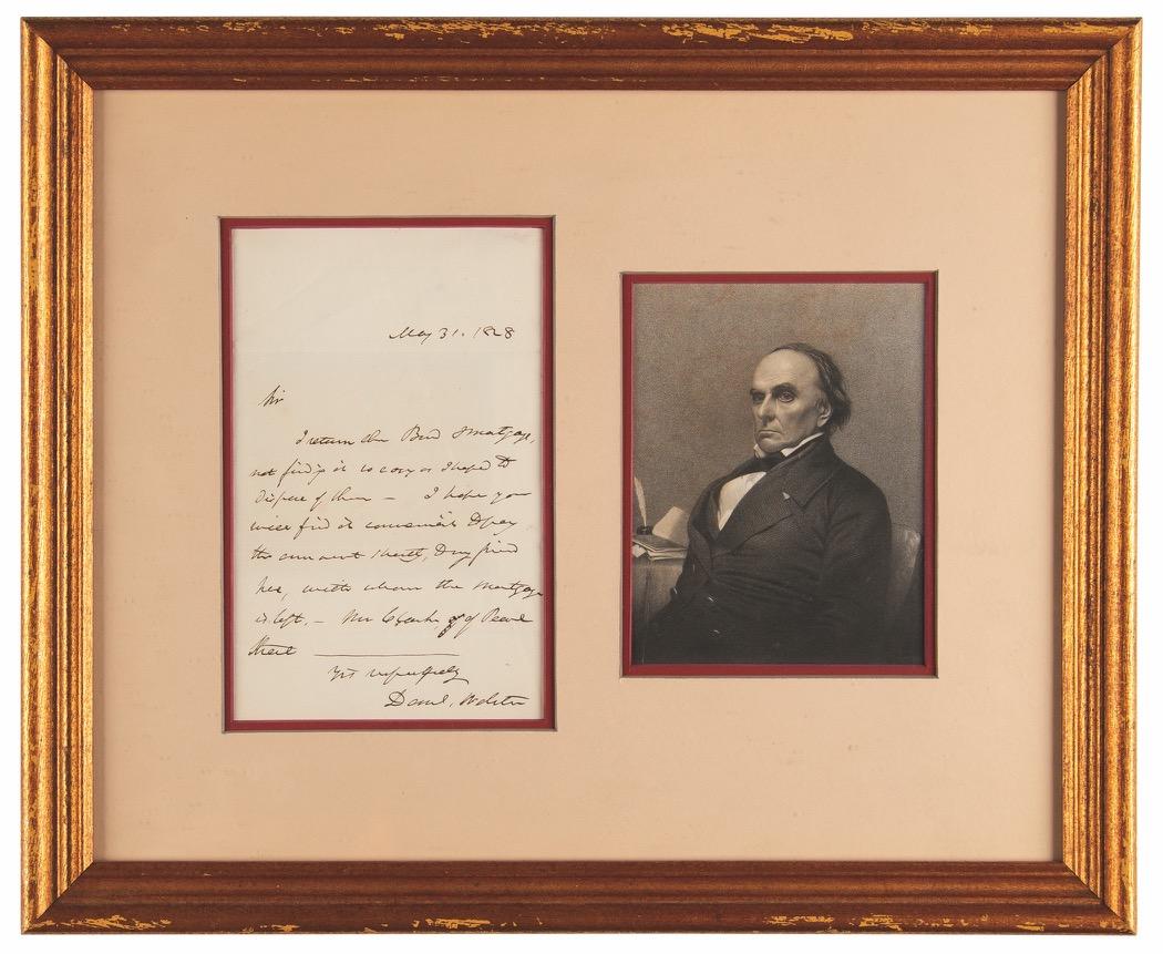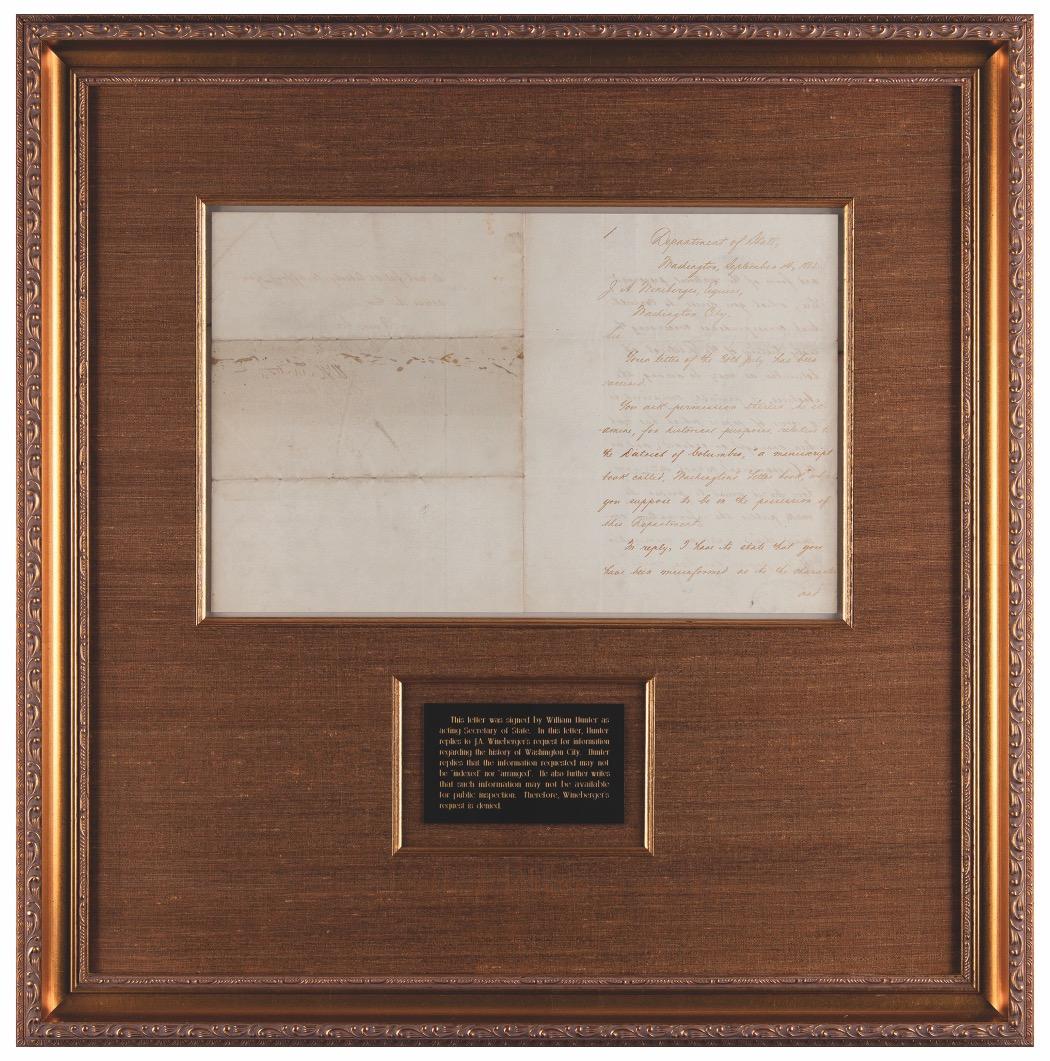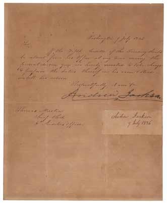 7. Andrew Jackson Letter Signed as President. LS as president, one page, 8 x 10, July 9, 1835. Letter to Thomas Mustin, chief clerk of the 5th auditor’s office, in full: “If the Fifth Auditor of the Treasury should be absent from his Office at any time during the present season you are hereby directed to take charge & perform the duties thereof in his room & stead until his return.” Signed boldly at the conclusion by Andrew Jackson as president. In fine condition, with heavy overall toning, and an identifying collector’s slip affixed below the signature Starting Bid $200
