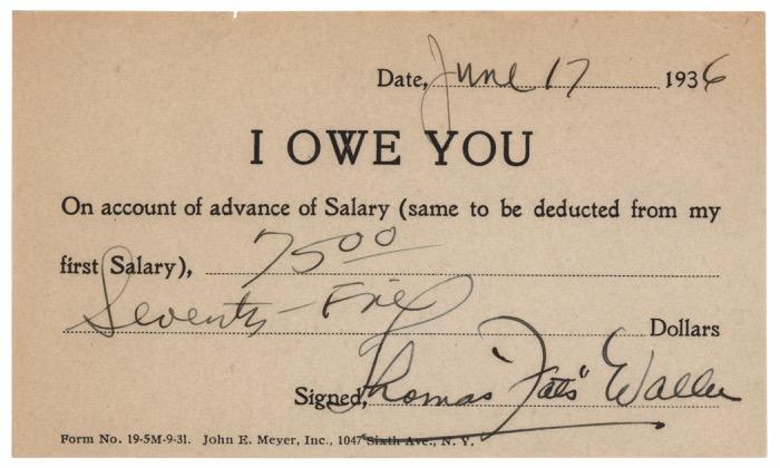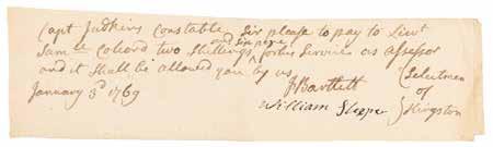 Signed. Physician and signer of the Declaration of Independence from New Hampshire (1729-1795) who served as that state’s governor from 1790 to 1794. ADS signed “J. Bartlett,” one page, 7.75 x 2, January 3, 1769. Handwritten pay order issued to “Capt. Judkins Constable,” requesting that he “pay to Lieut. Sam’ll McChord two Shillings and Six pence for his Service as Assessor and it shall be allowed you by us.” Signed at the conclusion by Bartlett on behalf of the “Selectmen of Kingston.” Countersigned below by William Sleeper. In fine condition. From the collection of Howard Reiche. Starting Bid $200