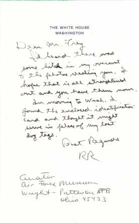 President Reagan makes a donation to the U.S. Air Force Museum: “I found the enclosed identification card and thought it might serve in place of my lost dog tags”